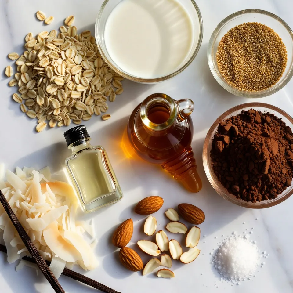 Rolled oats are a great source of fiber. They help keep you full and support digestion. Almond milk is low in calories and rich in vitamins E and D, which help your skin and bones. Chia seeds provide omega-3 fatty acids, which are good for your heart. Cocoa powder is full of antioxidants, which protect your cells. Maple syrup gives a natural sweet flavor and has minerals like zinc and manganese. Shredded coconut adds healthy fats, while chopped almonds offer protein and more fiber. This mix of ingredients makes for a tasty and healthy breakfast.