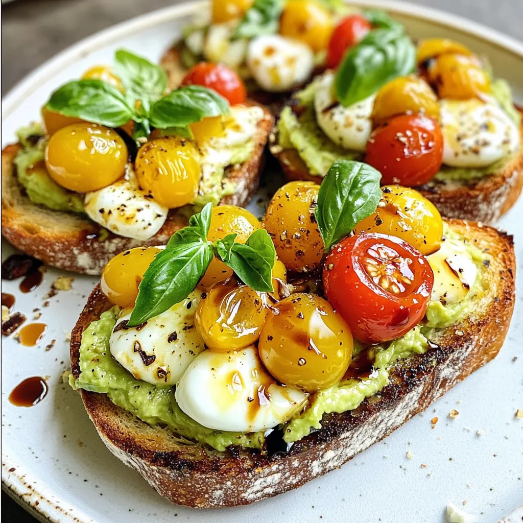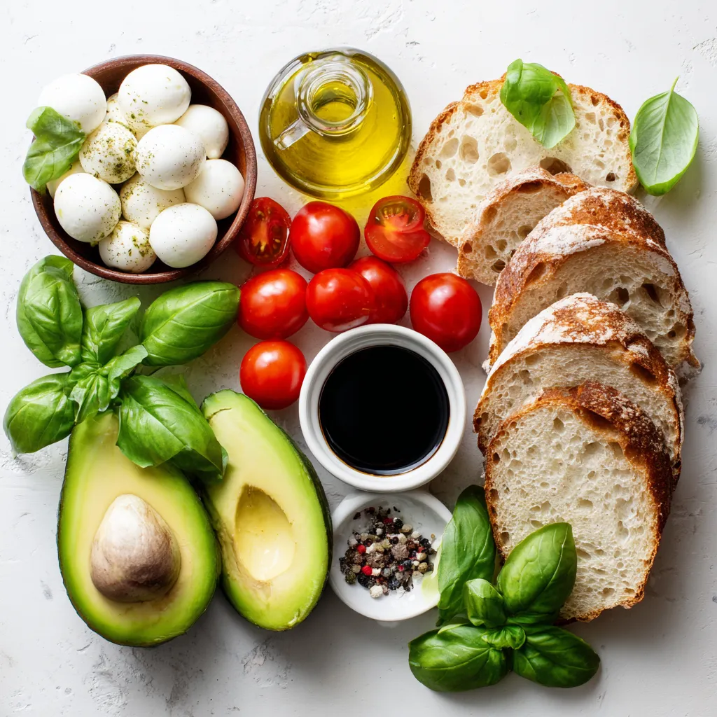 These fresh ingredients create a tasty and healthy dish. The avocados give creaminess. Cherry tomatoes add a sweet touch. Mozzarella brings a soft texture, while basil adds aroma. Balsamic glaze gives a sweet and tangy finish. Olive oil enhances the flavors. Sourdough or whole-grain bread holds it all together. Each bite is a burst of flavor!