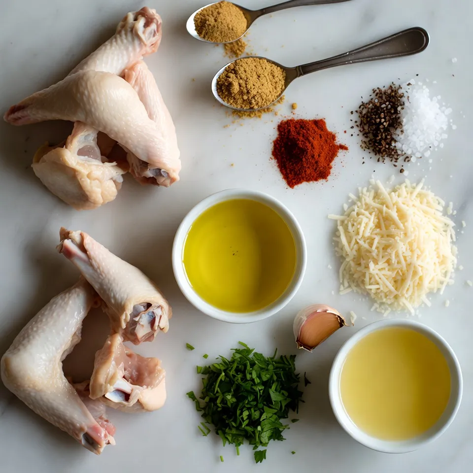 When making baked garlic Parmesan wings, I always start with fresh, high-quality ingredients. For the main ingredients, you need two pounds of chicken wings. They should be cleaned well before cooking. I use four tablespoons of olive oil to give the wings a nice coating. This helps the seasonings stick and adds flavor.