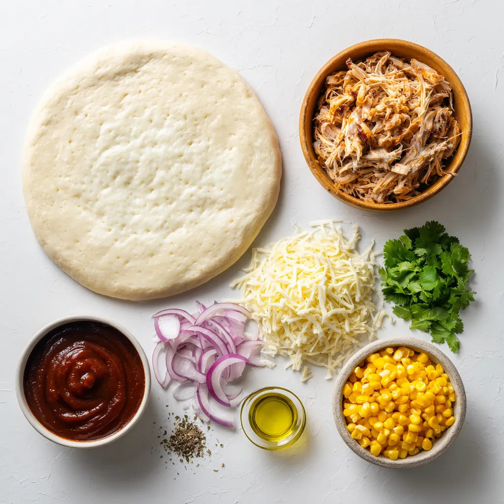 To make BBQ Ranch Chicken Pizza, gather all your ingredients. You can find pre-made pizza dough at most stores. I love using cooked pulled chicken for this pizza. This saves time and adds great flavor. Smoky BBQ sauce gives the dish a rich taste.
