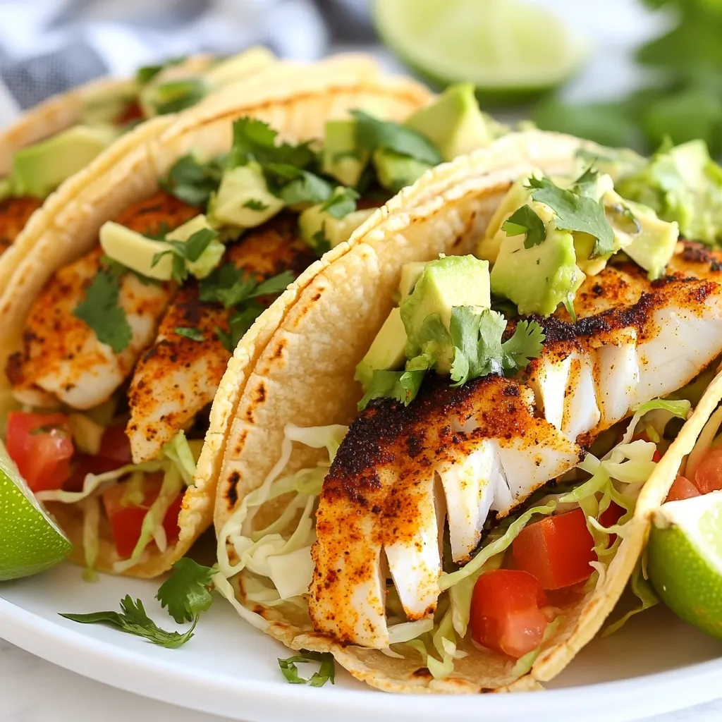 For this recipe, I use 1 pound of white fish fillets. Tilapia or mahi-mahi works great. The fish needs Cajun seasoning for flavor. You will need 2 tablespoons to coat each side well. Use salt and pepper to taste. Fresh produce brings life to the tacos. You will need: - 1 cup shredded cabbage - 1 ripe avocado, sliced - ½ cup diced tomatoes - ¼ cup fresh cilantro, chopped - 1 lime, cut into wedges These bright ingredients make the dish colorful and fresh. They add crunch, creaminess, and zest. I like to use 8 small corn tortillas. They hold the fillings well. You'll also need 2 tablespoons of olive oil for cooking. This oil helps create a nice sear on the fish. These ingredients come together to create tasty Blackened Cajun Fish Tacos. They are simple yet full of flavor. {{ingredient_image_1}} First, start with one pound of white fish fillets. I prefer tilapia or mahi-mahi for this dish. Pat the fish dry with paper towels. This step is key. It removes extra moisture and helps the fish sear better. Next, sprinkle two tablespoons of Cajun seasoning on both sides of the fillets. Make sure they are fully coated. Let the fish marinate for about ten minutes. This lets the flavors soak in. Heat a cast-iron skillet or large frying pan over medium-high heat. Add two tablespoons of olive oil when the skillet is hot. The oil should shimmer but not smoke. Carefully place the seasoned fish fillets in the pan. Cook for three to four minutes on each side. The fish should look charred and flake easily with a fork. Once done, remove the fish from the skillet and let it rest for a minute. Flake the fish into bite-sized pieces. Warm eight small corn tortillas in a separate pan over low heat. Heat them for one to two minutes on each side. This makes them soft and easy to fold. Now, take a tortilla and add a generous amount of shredded cabbage. Follow this with a portion of the flaked fish. Next, top it off with sliced avocado and diced tomatoes. Finish with a sprinkle of fresh cilantro. Serve the tacos with lime wedges on the side. Squeeze some lime juice over the tacos for extra flavor. Enjoy every bite! To get that nice char on your fish, start with dry fillets. Pat them with paper towels to remove moisture. Next, season both sides well with Cajun spice. Heat your pan until it’s hot, then add olive oil. Place the fish in the pan and don’t touch it for 3-4 minutes. This helps create that beautiful crust. Flip it gently and cook the other side. The fish should be flaky and golden with a bit of blackened color. Warming your tortillas is easy and important for great tacos. Use a separate pan over low heat. Place each tortilla in the pan for about 1-2 minutes. Flip them over to warm both sides. This makes them soft and easy to fold. You can also wrap them in a clean kitchen towel to keep them warm until you’re ready to serve. Toppings can really elevate your tacos. I love adding shredded cabbage for crunch. Sliced avocado adds creaminess, and diced tomatoes bring freshness. Fresh cilantro gives a burst of flavor. Don’t forget lime wedges! Squeezing lime juice over the tacos adds a bright taste that ties everything together. Mix and match your toppings to find what you love best! Pro Tips Pat the Fish Dry: Ensuring the fish is dry before seasoning helps achieve a better sear and prevents it from steaming in the pan. Let it Marinate: Allowing the fish to marinate in Cajun seasoning for at least 10 minutes enhances the flavor and allows the spices to penetrate the fish. Use High Heat: Cooking the fish on medium-high heat creates a beautiful char while keeping the inside flaky and moist. Warm Tortillas Properly: Warming tortillas over low heat makes them soft and pliable, preventing them from cracking when filled. {{image_2}} You can use different fish for your tacos. Tilapia and mahi-mahi are great choices. Try using snapper or cod for a unique taste. If you prefer a firmer fish, go for swordfish or tuna. Each fish brings its own flavor and texture. Just make sure to season them well. This keeps the tacos flavorful and fun! If you want more heat, add extra Cajun seasoning. You can also mix in some diced jalapeños for a kick. For a vegetarian option, replace the fish with grilled veggies. Bell peppers, zucchini, and mushrooms work well. Roast them to bring out their sweetness. You can also use black beans or chickpeas for protein. These options keep your tacos tasty and satisfying. Corn tortillas are classic for these tacos. They have a nice flavor and texture. But you can switch it up! Flour tortillas are soft and great for holding fillings. Try lettuce wraps for a low-carb option. They add a fresh crunch without the carbs. Consider serving the fish over rice bowls for a fun twist! Each choice adds a different vibe to your meal. Store leftover fish tacos in an airtight container. Place them in the fridge. They stay fresh for up to two days. Keep the fish separate from the tortillas and toppings. This keeps everything from getting soggy. If you have extra toppings, store them in small containers. To reheat, use a skillet for best results. Heat it on medium and add the fish. Cook for a few minutes until hot. For tortillas, wrap them in foil and warm in the oven. This keeps them soft. You can also microwave them, but they may get chewy. You can freeze the fish, but not the whole tacos. Place cooked fish in a freezer bag. Remove as much air as you can. Freeze for up to three months. When ready to eat, thaw in the fridge overnight. Reheat in a skillet before serving. The best fish for tacos is white fish. I suggest using tilapia or mahi-mahi. Both have a mild taste and cook well. They hold up nicely with the bold flavors of Cajun seasoning. Other options include snapper or cod, but tilapia and mahi-mahi are my favorites. Yes, you can make these tacos gluten-free. Use corn tortillas, which are naturally gluten-free. Check the label to ensure there are no added gluten ingredients. You can also use lettuce wraps