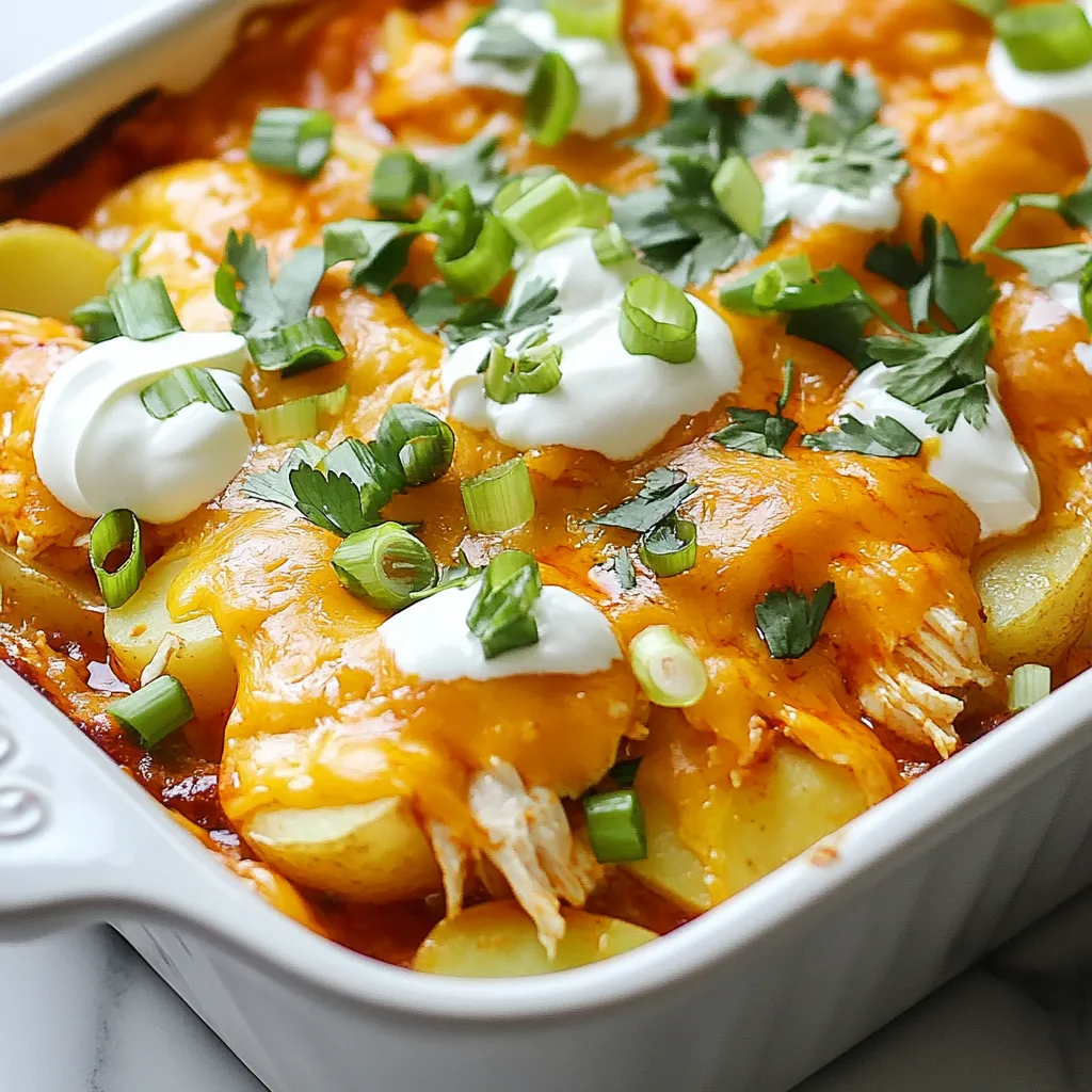 To make a tasty Buffalo Chicken Potato Bake, gather these ingredients: - 4 medium russet potatoes, cubed - 2 cups cooked chicken, shredded - 1/2 cup buffalo sauce - 1 cup cheddar cheese, shredded - 1/2 cup blue cheese crumbles - 1/2 cup sour cream - 1/4 cup green onions, sliced - 2 tablespoons olive oil - Salt and pepper to taste - Fresh parsley for garnish These ingredients come together to create a dish that is both savory and comforting. The russet potatoes provide a fluffy base. The shredded chicken gives protein and flavor. Buffalo sauce adds a spicy kick, which pairs well with the creamy cheeses. Sour cream brings balance, while green onions add freshness. Olive oil enhances the dish, and parsley makes it look pretty. You can always adjust the buffalo sauce to suit your taste. If you like it mild, use less. If you love heat, add more! Each ingredient plays its part, making this dish a hit for any meal. {{ingredient_image_1}} - Preheat oven to 400°F (200°C). - Boil potatoes until fork-tender. Start by heating your oven to 400°F. This temperature gives the cheese a nice melt. Next, take your cubed russet potatoes and put them in a pot of salted water. Boil them for about 10 to 12 minutes. You want them soft enough to pierce with a fork but not mushy. When they’re ready, drain them and set aside. - Combine chicken with buffalo sauce. - Layer ingredients and bake. In a large bowl, mix your shredded chicken with buffalo sauce. Make sure each piece is well-coated. This adds a spicy kick to your dish. Now, grab a large baking dish and drizzle some olive oil at the bottom. Spread the cooked potatoes evenly across the dish. Season them with salt and pepper for extra flavor. Next, layer the buffalo chicken on top of the potatoes. Finally, sprinkle the shredded cheddar cheese and blue cheese crumbles over everything. Bake your dish in the oven for 20 to 25 minutes. You’ll know it’s done when the cheese is bubbly and golden. - Drizzle with sour cream and garnish. Once you pull the dish from the oven, let it cool for about 5 minutes. This step makes serving easier. Drizzle some sour cream over the top for creaminess. Then, finish with sliced green onions and fresh parsley. This not only adds color but also brightens the flavors. Now, your Buffalo Chicken Potato Bake is ready to enjoy! - Adjust buffalo sauce to taste. Start with half a cup. Add more if you like heat. - For perfect potato texture, boil them until fork-tender. This should take about 10-12 minutes. Drain them well. - Serve straight from the baking dish. It gives a rustic look. - Add fresh parsley on top for color. You can also drizzle extra buffalo sauce for those who want more flavor. - Pair this dish with a simple green salad. It balances the rich flavors. - For drinks, I suggest a light beer or sparkling water. Both complement the spice of the dish well. Pro Tips Adjust the Heat: Feel free to adjust the amount of buffalo sauce according to your spice preference. Start with less and add more if you like it hotter! Cheese Variations: Experiment with different cheeses! Pepper jack or mozzarella can add a unique flavor twist to your bake. Meal Prep Friendly: This dish can be prepped ahead of time. Assemble everything and store it in the fridge, then bake when you're ready to serve. Serving Suggestions: Pair with celery sticks or carrot sticks for a refreshing crunch that complements the richness of the dish. {{image_2}} You can change the protein in this dish easily. Turkey works great instead of chicken. You can even use shredded pork for a twist. For cheese, try Monterey Jack or Pepper Jack to add a fun flavor. Mixing different cheeses can make each bite special. The buffalo sauce can be spicy or mild, depending on your taste. If you like heat, stick with hot sauce. For a milder option, find a mild buffalo sauce. You can also add veggies for extra crunch. Bell peppers or broccoli blend well with the potatoes and chicken. If you want a vegetarian version, swap chicken for chickpeas or lentils. You can use cauliflower instead of potatoes for a low-carb option. For gluten-free, make sure your buffalo sauce and other ingredients are gluten-free. These changes keep the dish tasty and fit different diets. To keep your Buffalo Chicken Potato Bake fresh, let it cool first. Then, place it in an airtight container. This helps seal in flavor and moisture. Store it in the fridge for up to three days. If you want to save it longer, freezing works too. Cut it into portions and wrap each piece tightly in plastic wrap. Then, put the wrapped portions in a freezer bag. This method keeps the tastes intact for about two months. When reheating, the oven is your best friend. Preheat it to 350°F (175°C). Place the leftovers in an oven-safe dish. Cover it with foil to keep moisture in. Bake for about 20 minutes or until hot. If you use a microwave, put it in a microwave-safe bowl. Heat in short bursts, stirring in between. This keeps the texture nice and soft. For crispy edges, finish with a minute under the broiler. In the fridge, your Buffalo Chicken Potato Bake lasts about three days. Look for signs that it has gone bad. If you see mold or it smells sour, it's time to toss it. If it feels slimy, do not eat it. Always trust your senses to decide when food is no longer safe. Buffalo Chicken Potato Bake is a warm and tasty dish. It combines crispy potatoes and spicy chicken. You start with cubed russet potatoes. Then, mix shredded chicken with buffalo sauce. Next, layer them in a baking dish. Add cheese on top for a melty finish. This dish is perfect for sharing and full of flavor. Yes, you can prepare this dish ahead of time! Cook the potatoes and chicken in advance. Store them separately until you are ready to bake. When you are ready, layer the ingredients and bake. This method saves time on busy days. Buffalo Chicken Potato Bake can be kid-friendly! You can use less buffalo sauce for a milder taste. Consider adding more cheese to make it c