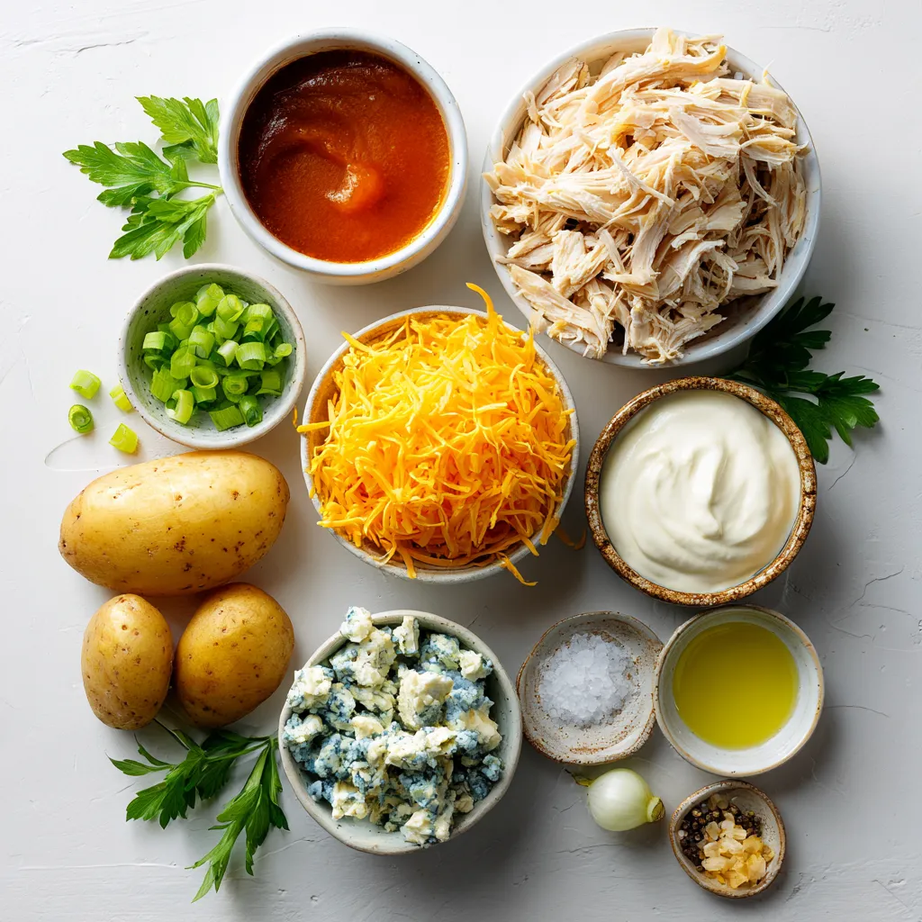 These ingredients come together to create a dish that is both savory and comforting. The russet potatoes provide a fluffy base. The shredded chicken gives protein and flavor. Buffalo sauce adds a spicy kick, which pairs well with the creamy cheeses. Sour cream brings balance, while green onions add freshness. Olive oil enhances the dish, and parsley makes it look pretty.