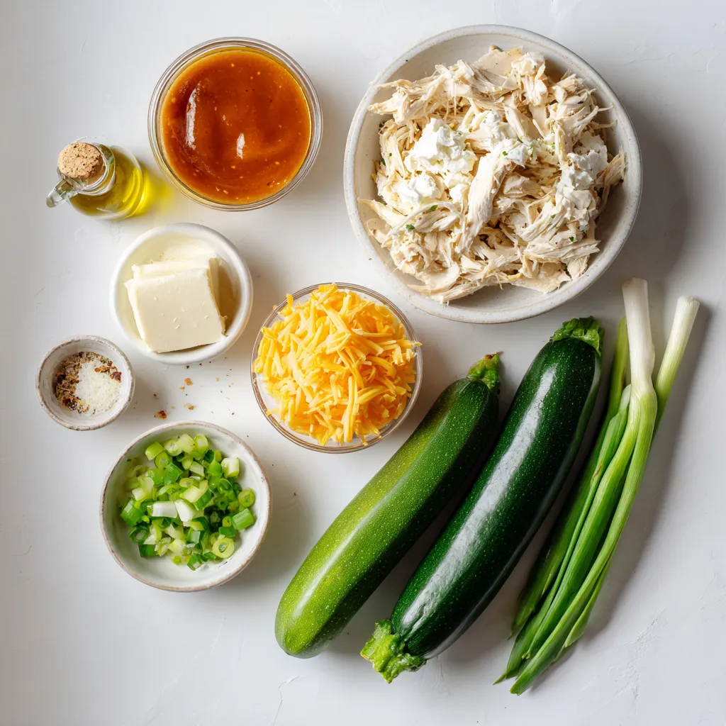 This recipe starts with some key ingredients. First, you need zucchinis. They serve as the perfect base for our stuffed dish. Next, you’ll want cooked shredded chicken. It gives the dish its heartiness. Buffalo sauce adds a spicy kick that makes it fun. Cream cheese brings a rich creaminess that balances the heat.
