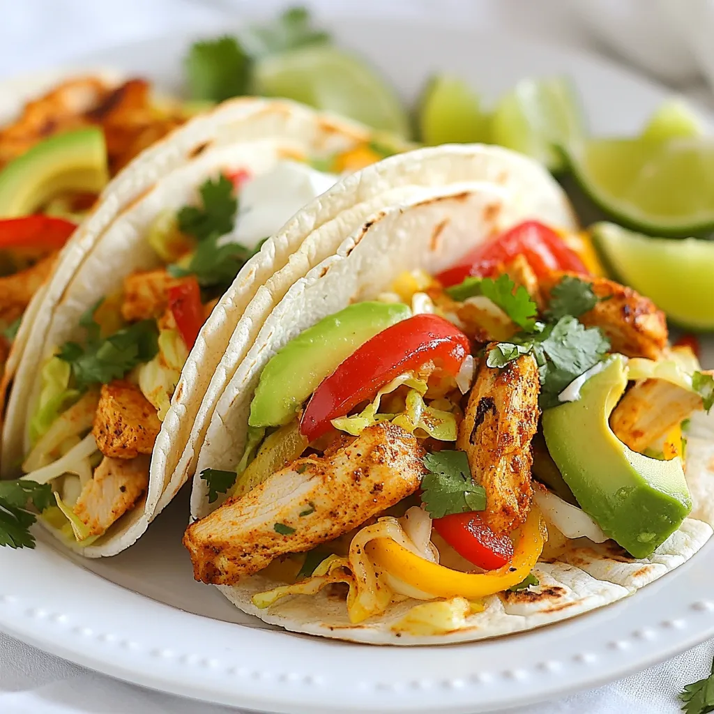 On each warm tortilla, layer the cooked chicken first. Then add the sautéed peppers and onions. Next, place sliced avocado and shredded cabbage on top. This order helps keep everything in place.