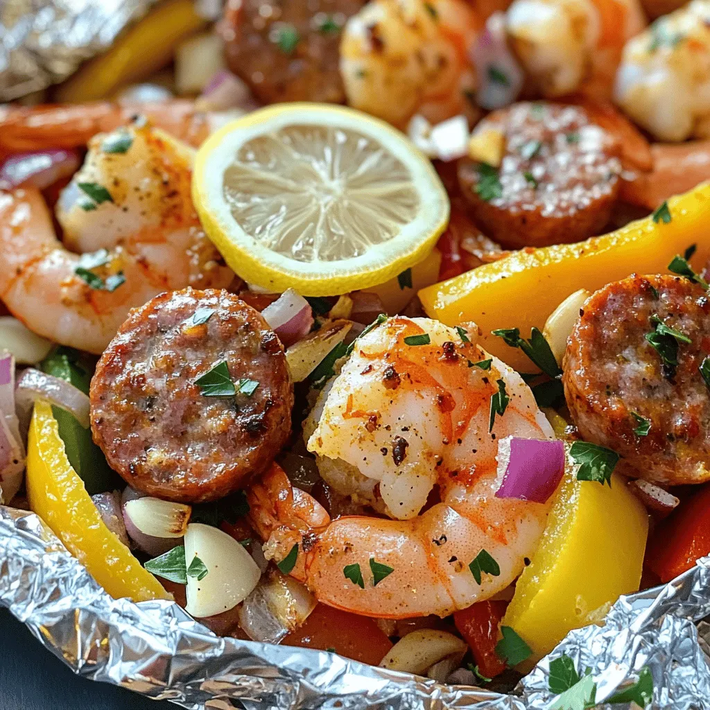 Now, divide the mixture evenly among the foil pieces. Make sure each packet gets shrimp and sausage. Top each packet with lemon slices for that extra zing. Fold the foil tightly to seal in the steam. Your packets should look like little presents ready to cook.