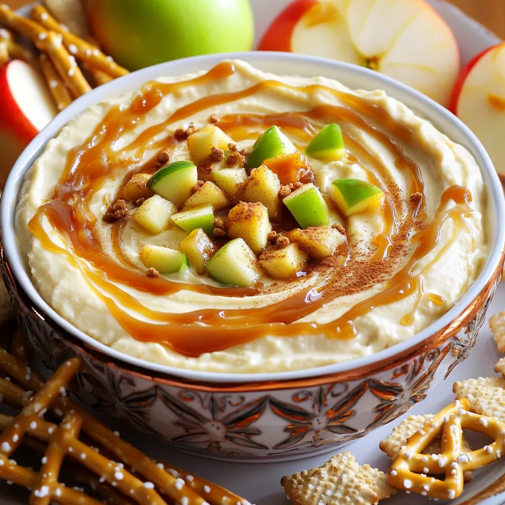 To make this tasty caramel apple cheesecake dip, you will need: - 8 oz cream cheese, softened - 1 cup powdered sugar - 1 teaspoon vanilla extract - 1/2 teaspoon ground cinnamon - 1 cup sour cream - 1 cup caramel sauce (save 2 tablespoons for drizzling) - 1 large apple (like Granny Smith or Honeycrisp), diced - 1/2 cup toffee bits For dipping, I recommend trying: - Graham crackers - Pretzel sticks These additions bring a crunchy texture and enhance the flavor of the dip. When picking apples, choose ones that are firm and crisp. Look for apples that have rich color and no bruises. Granny Smith apples offer a tart taste that balances the sweet dip. Honeycrisp apples are juicy and sweet, adding a great flavor. Always wash your apples well before using them. First, grab a large mixing bowl. Put in 8 ounces of softened cream cheese. Use an electric mixer to beat it until it's smooth and creamy. This step is key for a great dip. Next, add 1 cup of powdered sugar. Mix it well until you see no lumps. Now, add 1 teaspoon of vanilla extract and 1/2 teaspoon of ground cinnamon. These add a nice flavor boost. Finally, mix in 1 cup of sour cream. Beat it all together until it looks silky and smooth. Now, it’s time to fold in the caramel. Take 3/4 cup of caramel sauce and gently mix it into the cream cheese base. Save the last 2 tablespoons for later. Then, add in your diced apple. I like to use a Granny Smith or Honeycrisp for their crunch. Stir in 1/2 cup of toffee bits, making sure they get coated in the dip. This adds a sweet crunch that pairs perfectly with the creamy base. Once everything is mixed, transfer the dip to a nice serving bowl. Drizzle the reserved caramel sauce on top. For an extra touch, sprinkle more toffee bits for extra crunch. Serve this dip right away with graham crackers or pretzel sticks. I also like to add a few apple slices around the bowl for decoration. A sprinkle of cinnamon gives it a lovely look and flavor. Enjoy this tasty treat with friends and family! To make your dip super creamy, start with soft cream cheese. Let it sit at room temperature for about 30 minutes. This helps it mix better. Use an electric mixer at medium speed to whip it. Beat until it's smooth without lumps. Finally, add the sour cream slowly and mix well. This makes the dip silky and rich. For a great look, use a fun bowl. After you place the dip inside, drizzle some caramel sauce on top. This adds a nice shine. You can also sprinkle extra toffee bits on top for crunch. Surround the dip with apple slices for color. It makes the dish pop and adds a fresh touch. If you have leftovers, store them in an airtight container. Keep it in the fridge for up to three days. When you want to eat it again, just stir it up. If it's too thick, add a splash of milk or cream. This will help it regain its creamy texture. Avoid reheating in the microwave, as it can change the taste. Enjoy your dip fresh for the best flavor! {{image_2}} You can make this dip lighter without losing flavor. Use low-fat cream cheese instead of regular. Greek yogurt is a great swap for sour cream. It adds protein and a nice tang. You can also use a sugar substitute for the powdered sugar. Look for ones that measure like regular sugar. Get creative with this dip! Add a splash of maple syrup for extra sweetness. Try using almond extract instead of vanilla for a unique taste. You might also add chopped nuts like walnuts or pecans. They give a nice crunch and flavor boost. If you love chocolate, mix in mini chocolate chips for a fun twist. This dip shines in fall, but you can adapt it for other seasons. In spring, swap apples for ripe strawberries or peaches. Summer brings fresh berries, which pair well with the creamy dip. In winter, try adding a touch of peppermint extract for a festive flair. Each season brings a new way to enjoy this tasty treat. To keep your caramel apple cheesecake dip fresh, store it in an airtight container. Place it in the fridge right after serving. Be sure to cover the dip tightly. This keeps it creamy and prevents it from drying out. If you have leftovers, use it within four days for the best taste. You can freeze this dip, but there’s a catch. Freezing may change its texture. To freeze, put it in a freezer-safe container. Leave some space at the top to allow for expansion. Seal it well and label it with the date. Use it within two months for the best flavor. Thaw it overnight in the fridge before serving. The main ingredients have different shelf lives. Cream cheese lasts about two weeks in the fridge after opening. Sour cream is good for about one to three weeks. Caramel sauce can last for months if stored well. The diced apple should be used within one day for the best crunch. Always check for signs of spoilage before use. Yes, you can make this dip ahead of time. Simply prepare the dip and store it in the fridge. It will stay fresh for up to two days. Just remember to cover it well. When you are ready to serve, drizzle the caramel on top. This way, it looks great and tastes fresh. For this recipe, I recommend using Granny Smith or Honeycrisp apples. Granny Smith apples give a nice tartness that balances the sweet dip. Honeycrisp apples add a juicy sweetness. You can also try Fuji or Gala apples for a different flavor. Just choose apples that are crisp and firm for the best texture. Making this dip gluten-free is easy. The main ingredients are already gluten-free. You just need to choose gluten-free dippers. Look for gluten-free graham crackers or use pretzel sticks made without gluten. Always check the labels to make sure they are safe. Enjoy your dip worry-free! This blog post covered how to make a delicious dip using simple ingredients. We explored the best apples, how to prepare the cream cheese base, and clever tips for creaminess. You can customize the dip with different flavors and learn how to store leftovers. Remember, this dip is easy to make and fun to share. So, gather your ingredients, invite som