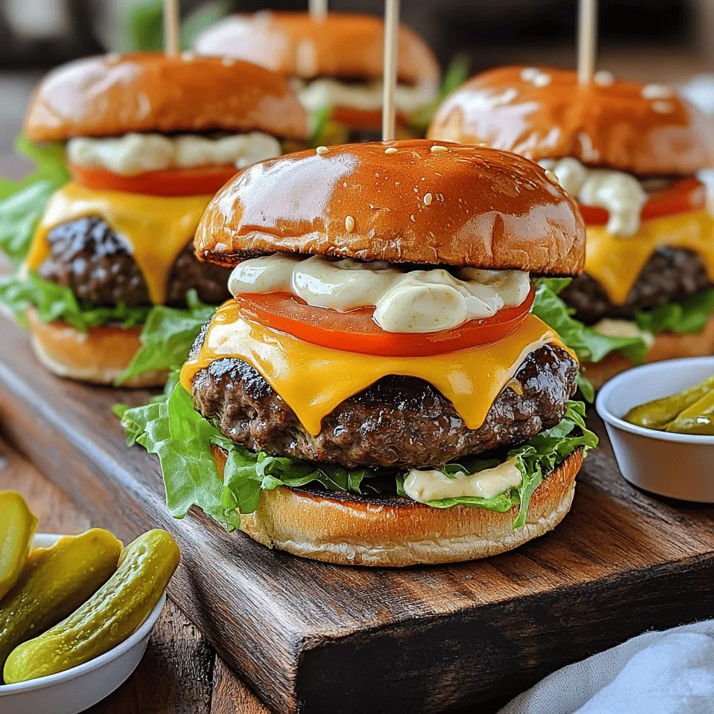 - 1 pound ground beef (80/20 blend) - 8 slider buns - 4 slices cheddar cheese, halved The main ingredients are key to making tasty cheeseburger sliders. I use an 80/20 blend of ground beef. This mix gives the sliders both flavor and juiciness. The slider buns should be soft and sturdy, holding all the goodness inside. I love using cheddar cheese for its rich taste and nice melt. - 1/4 cup mayonnaise - 2 tablespoons ketchup - 1 tablespoon yellow mustard - 1 tablespoon dill pickle relish - 1 tablespoon apple cider vinegar The special sauce is what sets these sliders apart. I mix mayonnaise, ketchup, and mustard for a creamy and tangy base. Dill pickle relish adds a nice crunch. Apple cider vinegar gives a perfect zing, balancing the flavors and making it pop. This sauce is easy to make and a real crowd-pleaser. - Lettuce leaves - Tomato slices - Pickles Garnishes add freshness and crunch to the sliders. I love using crisp lettuce leaves and juicy tomato slices. Pickles bring a delightful tang. You can mix and match these garnishes to fit your taste. They make the sliders look great and taste even better. To start, grab a large mixing bowl. Add 1 pound of ground beef, 1 teaspoon of garlic powder, 1 teaspoon of onion powder, salt, and pepper. Mix gently. Do not overwork the meat. This keeps it juicy. Next, divide this mixture into 8 equal parts. Shape these into sliders. Make them slightly bigger than your buns. They will shrink a bit while cooking. Now, we need to cook the sliders. Preheat your grill or skillet over medium-high heat. This should take about 5 minutes. Once hot, place the slider patties on the grill. Cook them for about 3-4 minutes on one side. Then, flip them over. Place half a slice of cheddar cheese on each patty. Cook for another 2-3 minutes. The cheese should melt nicely. While the sliders cook, let’s make the special sauce. In a small bowl, mix together 1/4 cup of mayonnaise, 2 tablespoons of ketchup, 1 tablespoon of yellow mustard, 1 tablespoon of dill pickle relish, and 1 tablespoon of apple cider vinegar. Stir until smooth. For a better texture, make sure the sauce is well mixed. This sauce adds a great flavor boost to the sliders. It’s time to assemble. First, toast the slider buns on the grill for 1-2 minutes. You want them golden brown. Take the bottom half of each bun. Spread a generous amount of the special sauce. Then, place a slider patty with melted cheese on top. Add lettuce, a slice of tomato, and pickles. Finish with the top half of the bun. Your cheeseburger sliders are ready to serve! - Checking for doneness: Use a meat thermometer. Aim for an internal temp of 160°F. This ensures the meat is safe and juicy. - Preventing overcooking: Cook sliders for about 3-4 minutes per side. Flip only once to keep them tender and flavorful. - Customizing the sauce flavors: Want a kick? Add hot sauce or smoked paprika. For a sweeter sauce, try a touch of honey. Mix and match to fit your taste. - Storage tips for leftover sauce: Store any extra sauce in a sealed container. It lasts up to a week in the fridge. Just give it a stir before using. - Serving suggestions: Place sliders on a wooden board. Add small bowls of extra sauce and pickles to enhance the look. - Optional sides that pair well: Serve with crispy fries or a fresh salad. These sides will balance the richness of the sliders and keep it fun! {{image_2}} You can change up the meat in your sliders. If you want a lighter option, try using ground turkey or ground chicken. Both of these meats work well. They have less fat but still taste great. Just season them well to keep that flavor. If you want a vegetarian option, consider black bean patties or chickpea sliders. These options are filling and tasty. You can even add spices for an extra kick. Cheese is key to a great slider. While I love cheddar, you can try different cheeses. Swiss or pepper jack can add unique flavors. For a sharp taste, blue cheese makes a bold choice. If you prefer vegan options, there are many plant-based cheeses now. Look for brands that melt well. They can be just as satisfying as regular cheese. Not all buns are created equal. If you want a gluten-free option, many brands offer gluten-free slider buns. These taste great and hold up well. You can also make homemade buns. They might take extra time but taste fresh. If you’re short on time, store-bought buns are a good choice. Just toast them for a better texture. To keep your leftover sliders fresh, follow these steps: - Refrigeration methods: Place the sliders in an airtight container. This helps keep them moist and tasty. You can also wrap them tightly in plastic wrap. Store them in the fridge for up to three days. - Best practices for reheating: When you're ready to eat, use the oven for the best results. Preheat it to 350°F (175°C). Place the sliders on a baking sheet and heat for about 10 minutes. This warms them through and keeps the buns soft. You can also use a microwave, but the buns may get chewy. To keep your special sauce fresh, here are some tips: - Shelf life of the sauce: This sauce can last for about one week in the fridge. Make sure to store it in a sealed container. - Tips for maintaining freshness: Always use a clean spoon when scooping out the sauce. This helps avoid contamination. If you notice any changes in color or smell, it's best to throw it away. You can prepare the sliders in advance. Start by mixing the ground beef, garlic powder, onion powder, salt, and pepper. Form the mixture into patties and place them on a tray. Cover the tray with plastic wrap and chill in the fridge. You can do this up to one day before cooking. When you're ready to grill, just preheat your grill or skillet and cook the sliders. Yes, you can freeze the sliders. After forming the patties, place them on a baking sheet and freeze them for about an hour. Once solid, transfer the patties to a freezer bag. They can last up to three months in the freezer. To cook, simply defrost them i
