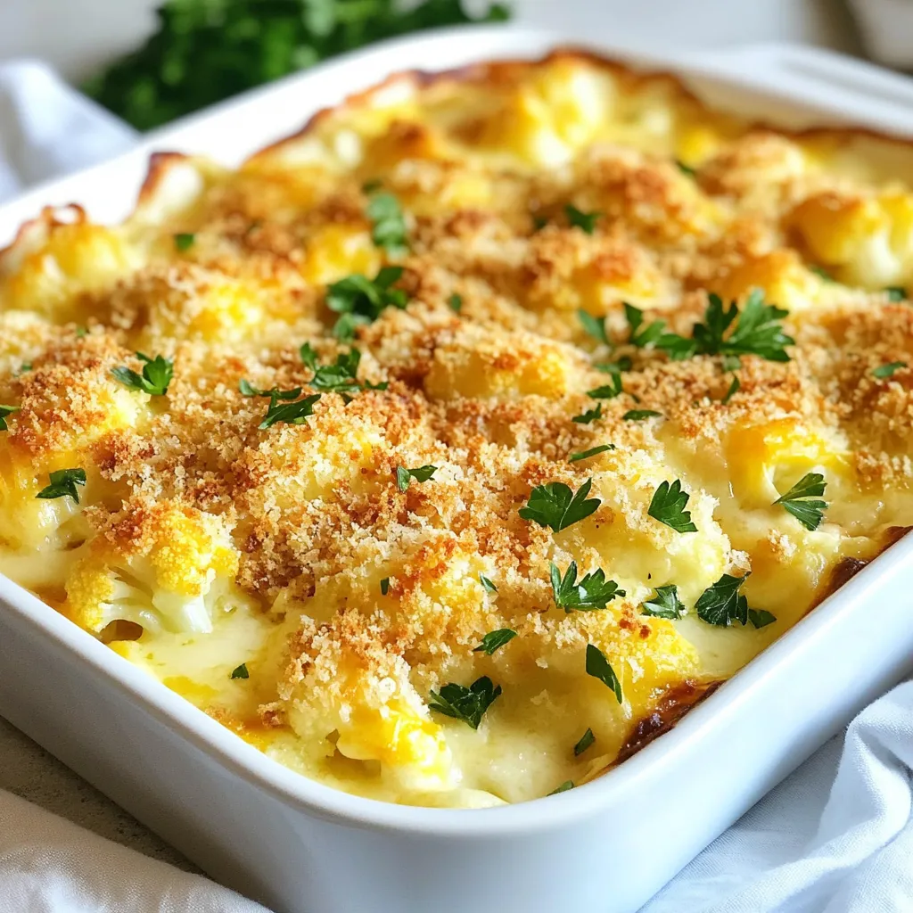 After baking, take the dish out of the oven. Let it sit for about 5 minutes to cool. This helps the cheese sauce thicken. Finally, sprinkle chopped fresh parsley on top for a pop of color and freshness. Now, it’s ready to serve! Enjoy your cheesy cauliflower au gratin!