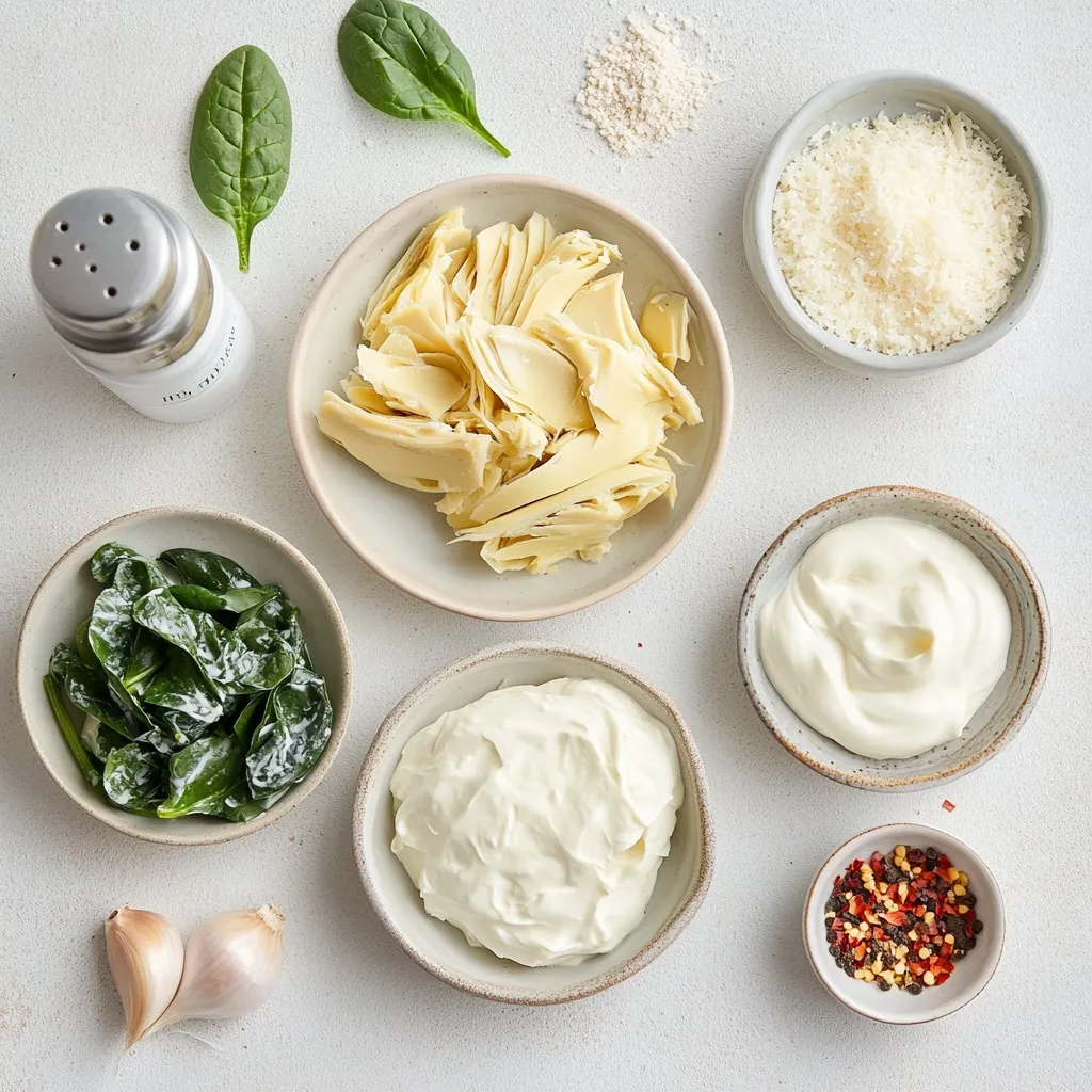 Here are the simple ingredients for Cheesy Spinach Artichoke Dip. This dip is creamy, cheesy, and full of flavor.