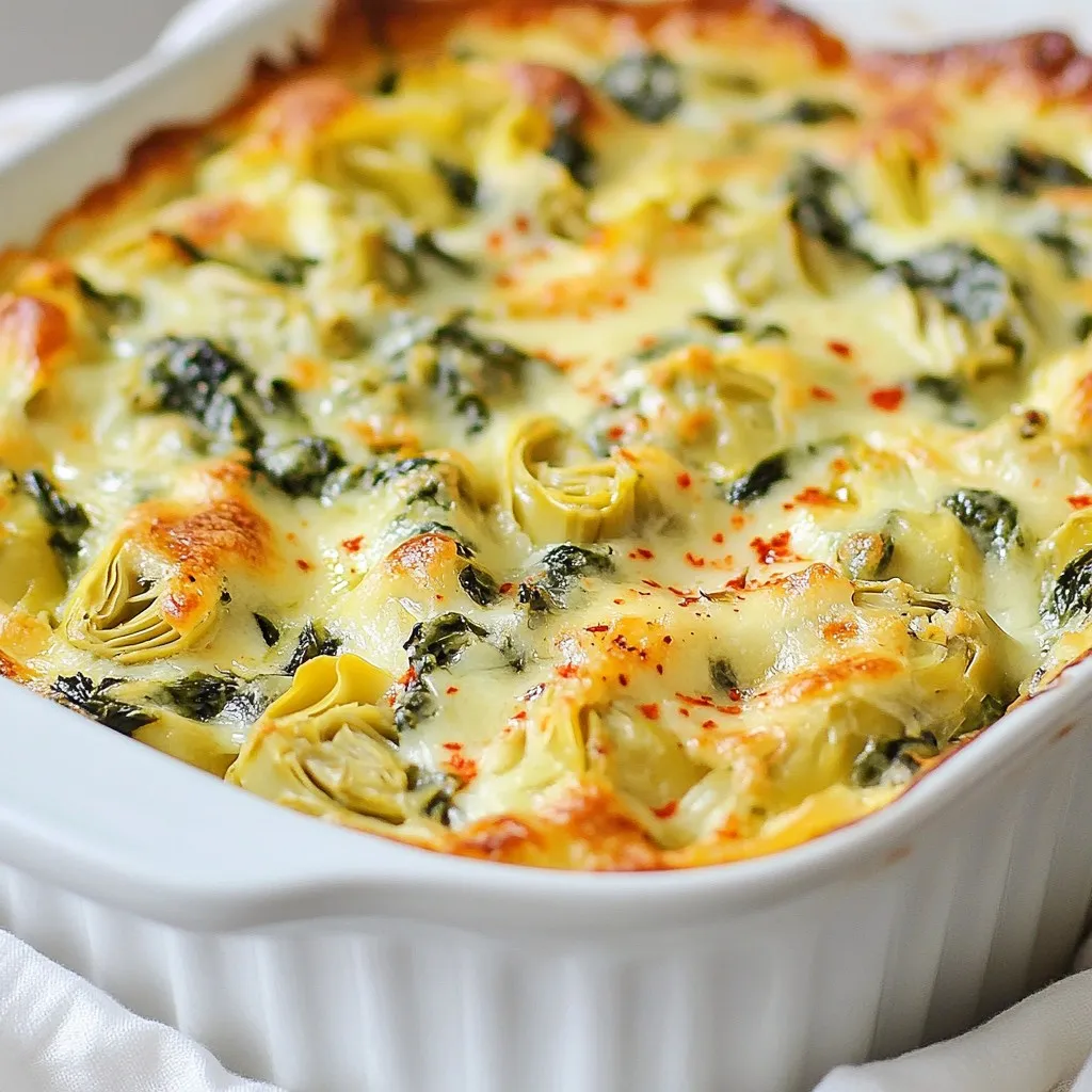 Here are the simple ingredients for Cheesy Spinach Artichoke Dip. This dip is creamy, cheesy, and full of flavor. - 1 cup frozen spinach, thawed and drained - 1 cup canned artichoke hearts, drained and chopped - 1 cup cream cheese, softened - 1/2 cup sour cream - 1/2 cup mayonnaise - 1 cup shredded mozzarella cheese - 1/2 cup grated parmesan cheese - 1 teaspoon garlic powder - 1/2 teaspoon onion powder - Salt and pepper to taste - Optional: red pepper flakes for a little heat Each ingredient plays a key role. The cream cheese gives it a rich base. Spinach and artichokes add great texture and taste. The blend of mozzarella and parmesan makes it cheesy and gooey. If you want some spice, red pepper flakes are a fun touch. This dip is perfect for parties or movie nights. Trust me, everyone will love it! {{ingredient_image_1}} - Preheat the oven to 350°F (175°C). - In a medium bowl, combine 1 cup of softened cream cheese, 1/2 cup of sour cream, and 1/2 cup of mayonnaise. Mix until smooth. - Stir in 1 cup of drained and chopped artichoke hearts and 1 cup of thawed and drained spinach. - Now, add 1 cup of shredded mozzarella cheese, 1/2 cup of grated parmesan cheese, 1 teaspoon of garlic powder, 1/2 teaspoon of onion powder, and salt and pepper to taste. - If you want a little heat, stir in a pinch of red pepper flakes. Mix everything until well combined. - Transfer the mixture into a baking dish and spread it out evenly. - Bake in the preheated oven for 25-30 minutes until the dip is bubbly and golden on top. Using fresh spinach makes a big difference. Fresh spinach has a bright taste. It adds a lovely texture too. If you can, opt for fresh over frozen. You can also try different cheese blends. Mixing mozzarella, gouda, or cheddar adds depth and creaminess. Each cheese brings its unique flavor. This dip goes well with many things. Serve it with tortilla chips, warm bread, or fresh veggies. Crackers work too! For parties, consider using small bowls. Place some dip in each bowl for guests. This way, it’s easy to share and enjoy. Herbs can boost the flavor of your dip. Try adding fresh dill or parsley for a fresh twist. They add a nice touch of brightness. If you like spice, adjust the heat level. You can add more red pepper flakes or even some diced jalapeños. Find the right balance for your taste buds! Pro Tips Use Fresh Spinach: If you have access to fresh spinach, feel free to substitute it for the frozen spinach. Just sauté it briefly until wilted before adding to the dip. Cheese Variations: Experiment with different types of cheese! Adding a bit of sharp cheddar or creamier brie can elevate the flavor profile. Make Ahead: You can prepare this dip a day in advance. Just cover it and store it in the refrigerator until you're ready to bake it. Serving Suggestions: Serve this dip with tortilla chips, sliced baguette, or fresh vegetables for dipping to create a delightful appetizer spread. {{image_2}} You can make this dip lighter. Use Greek yogurt instead of cream cheese. This swap cuts fat while keeping flavor. You can also try vegan options. Replace dairy with cashew cream or coconut yogurt. These choices are creamy and tasty. Want some heat? Add jalapeños for a spicy kick. It gives the dip a fun twist. For a Mediterranean vibe, mix in olives and feta cheese. The briny taste of olives adds depth to each bite. Make your dip festive for holidays. Try adding cranberry or roasted red peppers for a bright touch. These flavors give a holiday cheer. In summer, add fresh herbs like basil or parsley. This keeps the dip fresh and aromatic. To store leftover dip in the fridge, place it in an airtight container. Make sure to cover it tightly. This keeps it fresh and safe to eat. You can use it within three to four days. When you want to reheat the dip, use a microwave or oven. If using a microwave, heat it in short bursts. Stir in between to ensure even warming. If you use the oven, heat it at 350°F until warm. Yes, you can freeze Cheesy Spinach Artichoke Dip! Place it in a freezer-safe container. Make sure to leave some space at the top, as it will expand when frozen. You can freeze it for up to two months. To thaw, move it to the fridge overnight. For reheating, use the oven at 350°F for about 20-30 minutes. Stir it halfway through to heat evenly. The dip lasts about three to four days in the fridge. Always check for signs of spoilage before eating. Signs include a strange smell or mold on the surface. If you notice these signs, throw it away. Can you make Cheesy Spinach Artichoke Dip ahead of time? Yes, you can make this dip ahead of time. Prepare it, but do not bake it. Cover the dish and store it in the fridge for up to two days. When ready, bake it as directed. This saves time and makes it easy for parties. What can I substitute for mayonnaise? If you want to skip mayonnaise, use Greek yogurt or sour cream as a substitute. Both options add creaminess. They also keep the dip rich and tasty. Can this dip be made in a slow cooker? Yes, you can use a slow cooker for this dip. Just mix all the ingredients in the slow cooker and cook on low for 2-3 hours. Stir it occasionally for even heat and flavor. How do I know when the dip is done baking? The dip is done when it is bubbly and golden on top. You can check by inserting a spoon. If it comes out hot, your dip is ready to serve. What foods pair best with this dip? This dip goes well with chips, toasted bread, or fresh veggies. You can also serve it with crackers for a nice crunch. Each choice enhances the creamy flavors. Can I serve it cold instead of hot? While this dip is best hot, you can serve it cold. If you do, it will be thicker, like a spread. It may not have the same warm, gooey goodness, but it still tastes great! You have all the tools to make a tasty Cheesy Spinach Artichoke Dip. Start with simple ingredients and follow the easy steps. Remember, you can mix it up with flavors and healthier options. Serve it with chips or veggies for 