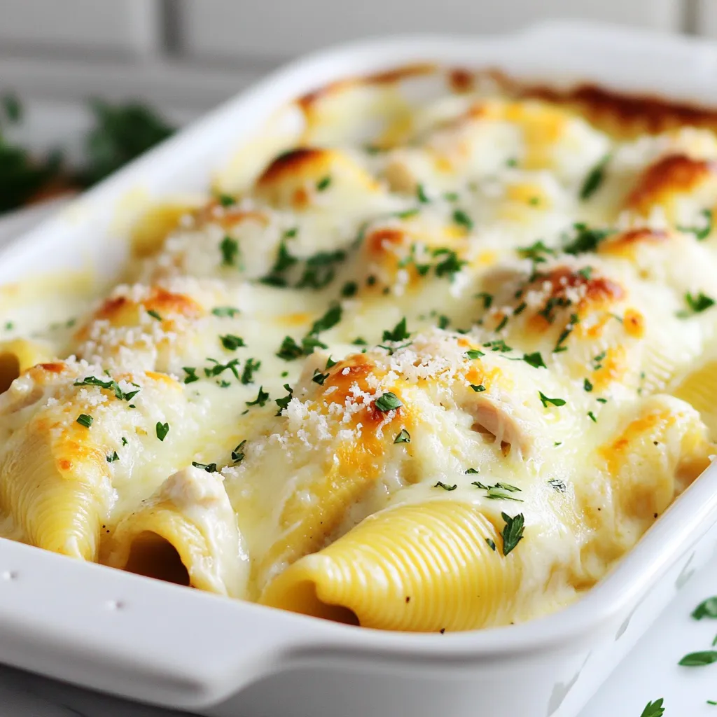 Delicious jumbo pasta shells filled with a creamy chicken and cheese mixture, topped with Alfredo sauce and baked to perfection.
