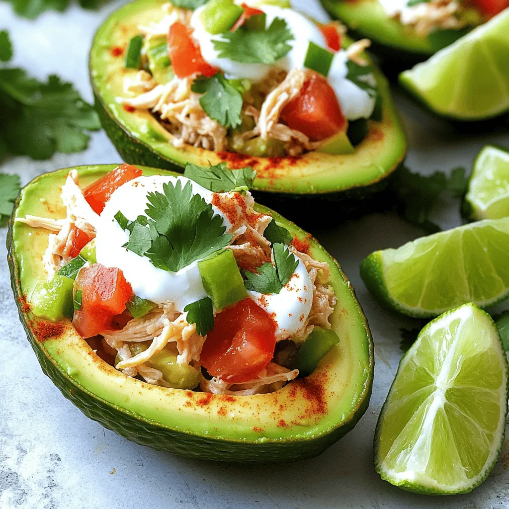 Now, it’s time to fill the avocados. Mash the reserved avocado flesh with a fork until creamy. Gently fold this into the chicken mixture to combine. Take your avocado halves and generously fill each one with the chili lime chicken mixture. For a nice touch, sprinkle extra cilantro on top for garnish. Squeeze fresh lime juice over the stuffed avocados to add extra zing.