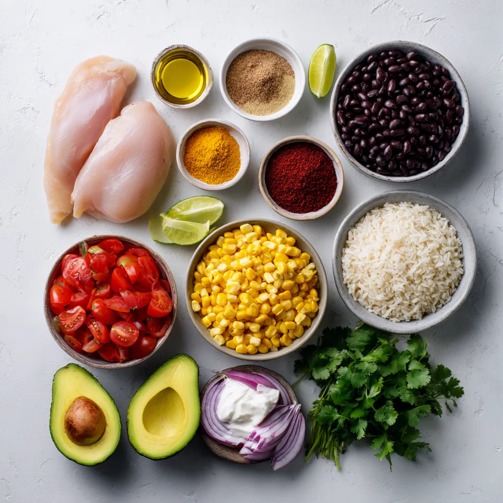 - Evenly distribute the black beans and corn over the rice. Top with the sliced chicken, diced avocado, cherry tomatoes, and diced red onion.