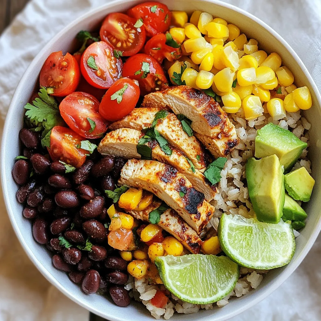 A great-looking bowl makes your meal more fun. Start with a base of cooked brown rice. Then, layer black beans and corn on top. Add sliced chicken, diced avocado, cherry tomatoes, and red onion. Finally, squeeze fresh lime juice over the top. Garnish with chopped cilantro for a pop of color. Optionally, add a dollop of sour cream or Greek yogurt for creaminess. This creates a tasty and beautiful meal.