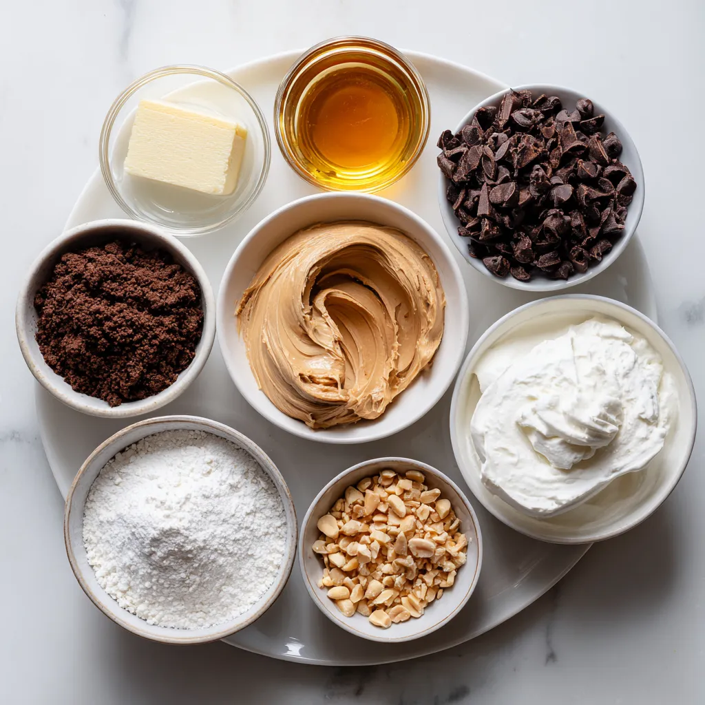 These ingredients create a rich flavor and smooth texture. The chocolate cookie crumbs make a great crust. The peanut butter filling is creamy and sweet. The melted chocolate topping adds a nice finish.