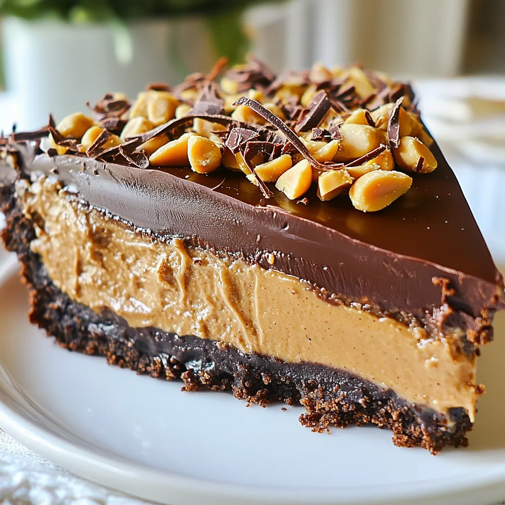 - Serve: Once set, slice the pie into wedges. Garnish with chopped peanuts and chocolate shavings, if desired.