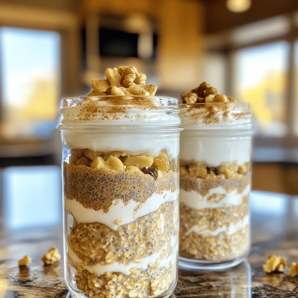 - 1 cup rolled oats - 1 cup unsweetened almond milk - 1 tablespoon chia seeds - 1 teaspoon vanilla extract - 1 teaspoon ground cinnamon - 1 tablespoon maple syrup - 1/4 cup Greek yogurt (optional) - 2 tablespoons chopped walnuts (optional) - 2 tablespoons raisins or currants (optional) - Additional toppings: cinnamon and chopped nuts To make cinnamon roll overnight oats, you need simple, wholesome ingredients. Start with rolled oats for a hearty base. They soak up the liquid well and create a creamy texture. Almond milk adds a nice nutty flavor, but feel free to use any milk you like. Next, add chia seeds for extra fiber and nutrition. They help thicken the oats while you sleep. A touch of vanilla extract brings warmth, while ground cinnamon gives that classic cinnamon roll taste. For sweetness, use maple syrup. It pairs perfectly with the oats. If you want a creamier mix, consider adding Greek yogurt. You can also toss in chopped walnuts for crunch or raisins for a bit of chewiness. Finally, top your oats with more cinnamon and some chopped nuts before digging in. These ingredients create a delicious morning treat that is both easy and satisfying. Start by gathering your dry ingredients. In a medium mixing bowl, combine 1 cup of rolled oats, 1 tablespoon of chia seeds, and 1 teaspoon of ground cinnamon. Stir well to mix everything evenly. This blend gives your oats that cozy cinnamon roll flavor. You want the chia seeds for added texture and nutrition. Next, grab another bowl or a measuring cup. Whisk together 1 cup of unsweetened almond milk, 1 teaspoon of vanilla extract, 1 tablespoon of maple syrup, and 1/4 cup of Greek yogurt. Mix until smooth. This creamy base adds richness and a hint of sweetness. If you prefer a vegan option, skip the Greek yogurt. Now, pour the wet mixture over the dry ingredients. Stir until everything is well-coated. If you want to add some crunch, fold in 2 tablespoons of chopped walnuts and 2 tablespoons of raisins or currants. Then, divide this delicious mixture into two or three containers. Cover them and refrigerate overnight. This lets the oats soak up the liquid and become soft. In the morning, stir well, add more almond milk if needed, and top with extra cinnamon and nuts. Enjoy your tasty morning delight! To get the best texture in your cinnamon roll overnight oats, you can adjust the liquid. If you find the oats too thick in the morning, simply add a splash of almond milk. This will make the oats creamy and easy to eat. The amount of almond milk you use can change how the oats feel. Start with one cup, and add more as needed. Presentation matters, especially for breakfast! Use clear jars to show off the beautiful layers of oats. After stirring the oats in the morning, pour them into the jars. Top with a swirl of Greek yogurt and a sprinkle of cinnamon. You can also add chopped nuts for a crunchy finish. This not only looks good but tastes great too! Do you like your oats sweeter? You can modify the maple syrup to suit your taste. If you want less sweetness, reduce the syrup. For a different flavor, try honey or agave syrup. You can also add a pinch of brown sugar or a splash of vanilla extract for extra flavor. Adjust the sweetness until it’s just right for you. {{image_2}} You can add many fun flavors to your cinnamon roll overnight oats. Try adding nutmeg for warmth. You can also use cardamom for a unique twist. If you want a sweeter taste, use vanilla or almond extract. Just a few drops can change the flavor big time. Mix and match spices to find your favorite combo! Need more protein in your oats? There are easy ways to add it. You can stir in a scoop of protein powder. This makes it filling and helps with muscle recovery. Greek yogurt is also a great choice. It adds creaminess and boosts protein. You could even mix in cottage cheese for a savory touch! Seasonal fruits make these oats even better. In spring, add fresh strawberries or blueberries. Summer is perfect for ripe peaches or cherries. Fall brings apples or pears, which are great with cinnamon. In winter, try dried fruits like cranberries or figs. Toppings like coconut flakes or pumpkin seeds add crunch too! To keep your cinnamon roll overnight oats fresh, use airtight containers. Glass jars work great. They allow you to see the layers and are easy to clean. Plastic containers can also work, but make sure they seal well. This helps prevent spills and keeps the oats tasty. Your cinnamon roll overnight oats will last about 3 to 5 days in the fridge. If you want the best flavor, eat them within 3 days. After that, the oats may lose some of their creaminess. Always check for any odd smells or changes in color before eating. To enjoy leftovers, you can eat them cold or warm them up. If you prefer warm oats, place them in the microwave. Heat for 30 seconds, then stir. If they seem too thick, add a splash of almond milk. This will help bring back that creamy texture. Always stir before serving! Yes, you can use steel-cut oats. However, they have a firmer texture. Steel-cut oats take longer to soak. You may need to let them soak overnight or longer. This helps them soften up. For best results, I recommend sticking with rolled oats for this recipe. Absolutely! To make these oats vegan, you can skip the Greek yogurt. Use a plant-based yogurt instead. Almond yogurt or coconut yogurt works great. These options keep the creaminess without dairy. You can also add more almond milk to reach your desired texture. If your oats are too thick, no worries! Just add more almond milk. Start with a little splash and stir. Keep adding until you reach the right consistency. Remember, the oats will thicken as they soak overnight, so adjust as needed in the morning. This post guided you to create simple, delicious overnight oats. We covered ingredients, steps, and useful tips. Adjust sweetness and add flavors to suit your taste. Store these oats correctly to enjoy them longer. You can even try different toppings o