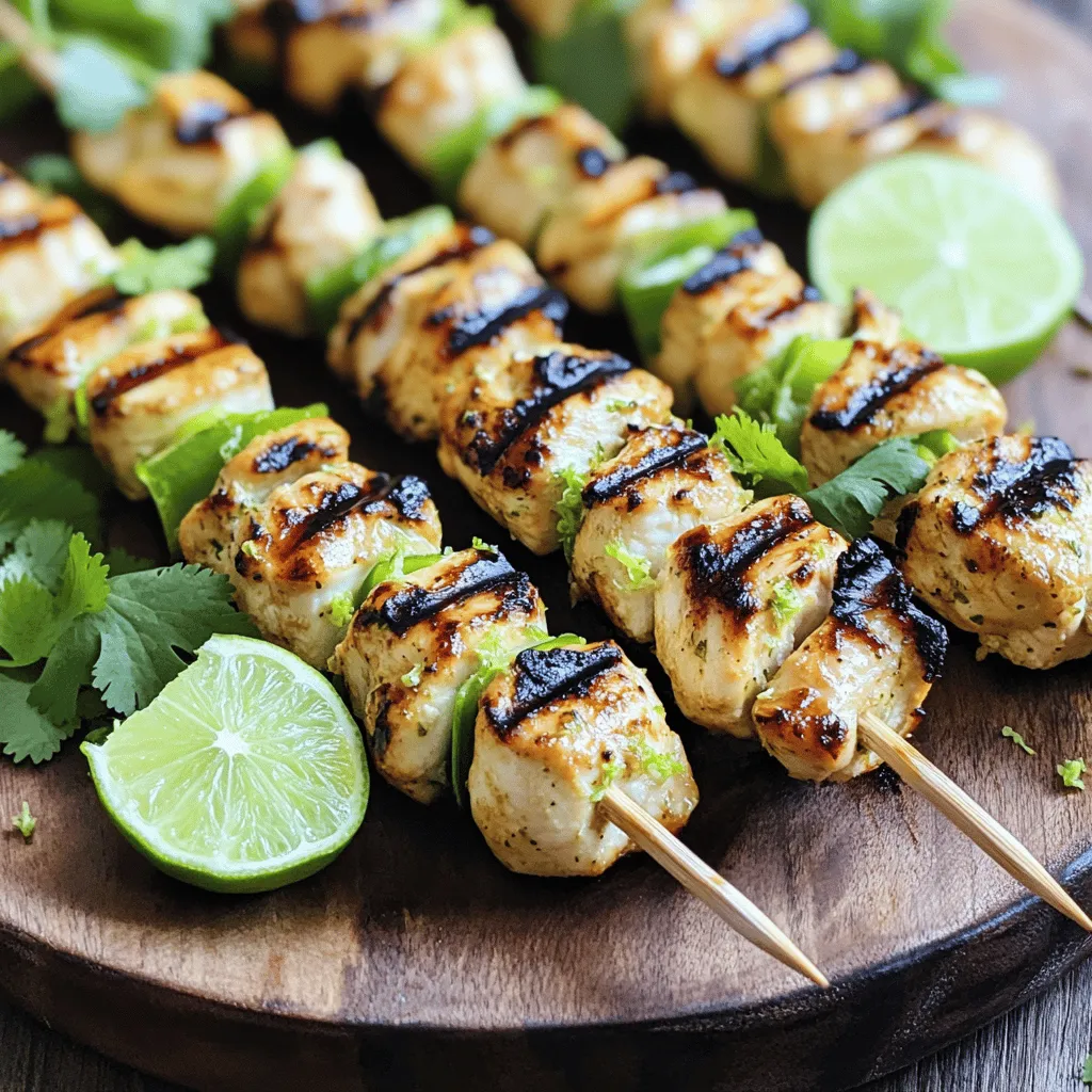 ![- 1 lb boneless, skinless chicken breasts, cut into 1-inch cubes - 1 cup coconut milk - Zest and juice of 2 limes - 2 tablespoons honey - 1 tablespoon soy sauce - 2 cloves garlic, minced - 1 teaspoon ginger, grated - 1/2 teaspoon salt - 1/4 teaspoon black pepper - Fresh cilantro, for garnish - Lime wedges, for serving Coconut milk is the star of this dish. It gives the chicken a creamy texture and a tropical taste. Lime zest and juice add bright, zesty notes that balance the richness of the coconut. Honey adds a touch of sweetness, while soy sauce gives depth and umami. Garlic and ginger bring warmth and flavor, enhancing the overall dish. Salt and black pepper help bring all the flavors together. You can use chicken thighs instead of breasts for a juicier bite. If you want a dairy-free option, use almond or oat milk instead of coconut milk. For a sweeter touch, swap honey with maple syrup. You can also replace lime with lemon for a different citrus taste. Fresh herbs like basil or mint can stand in for cilantro if you prefer. If you want to add some heat, mix in some chili flakes or hot sauce to the marinade. For the complete recipe, check out the Full Recipe link. To start, gather your ingredients. You will need coconut milk, lime zest, lime juice, honey, soy sauce, minced garlic, grated ginger, salt, and black pepper. In a bowl, whisk these ingredients together. This mix creates a tasty marinade. It will make your chicken juicy and full of flavor. Make sure all the flavors blend well. This step is key to getting the best taste in your skewers. Next, cut your chicken breasts into 1-inch cubes. Place the chicken in the bowl with the marinade. Stir well to coat each piece. Cover the bowl with plastic wrap. Let it sit in the fridge for at least one hour. If you can, marinate it overnight. This time helps the chicken soak up the flavors deeply. The longer you wait, the better it tastes. When you are ready to cook, preheat your grill to medium-high heat. Soak wooden skewers in water for about 30 minutes. This step keeps them from burning on the grill. After soaking, thread the marinated chicken onto the skewers. Leave a little space between the pieces. This helps them cook evenly. Once your grill is hot, place the skewers on it. Grill the chicken for 12 to 15 minutes. Turn them occasionally to get nice grill marks. Make sure the chicken is cooked through. When done, take the skewers off the grill. Garnish them with fresh cilantro and serve with lime wedges. For the full recipe, check here: [Full Recipe]. To get the best flavor, start with good chicken. Use boneless, skinless chicken breasts. Cut them into even 1-inch cubes. This helps them cook evenly. Preheat your grill to medium-high heat, around 400°F. When grilling, place the skewers on the grill. Cook them for 12 to 15 minutes. Turn them every few minutes. Look for nice grill marks. The chicken should be firm and no longer pink inside. This is how you know it's done. Marinating is key for tasty chicken skewers. I suggest marinating the chicken for at least one hour. However, overnight is even better. This allows the chicken to soak up all the coconut and lime flavors. Use a zip-top bag for easy marinating. Make sure all chicken pieces are covered in the marinade. If you can, flip the bag halfway through. This ensures even flavor. To make skewers, you need a few tools. Use wooden or metal skewers. If you use wooden skewers, soak them in water for 30 minutes. This stops them from burning on the grill. A pair of tongs is also essential. They help you turn the skewers safely. A thermometer is handy too. It tells you when the chicken reaches 165°F. This ensures it is safe to eat. For more details on the recipe, check the Full Recipe section. Enjoy making these delicious Coconut Lime Chicken Skewers! {{image_2}} You can swap chicken for other proteins. Shrimp works well with the same marinade. Just make sure to reduce the grilling time. Beef or pork can also be tasty. Cut them into 1-inch cubes like the chicken. Each protein will absorb the coconut and lime flavors differently. Experiment to find your favorite! If you want a meatless option, try tofu or tempeh. Press tofu to remove excess water first. This allows it to soak up the marinade better. You can also use veggies like bell peppers, zucchini, or mushrooms. They add color and flavor to the skewers. Just remember to adjust the grilling time for these options. To add some heat, mix in chili flakes or sriracha to the marinade. This will give your skewers a nice kick. If you prefer sweet, try adding more honey or a dash of brown sugar. You can also mix in some pineapple juice for a tropical twist. These simple changes can elevate the taste and keep it exciting. Check out the Full Recipe for more ideas! After enjoying your Coconut Lime Chicken Skewers, store any leftovers in an airtight container. Let them cool first. Place the container in the fridge. They will stay fresh for up to three days. If you want to keep them longer, consider freezing. To reheat your chicken skewers, use the oven for the best taste. Preheat your oven to 350°F (175°C). Place the skewers on a baking sheet. Cover them with foil to keep them moist. Heat for about 10-15 minutes. You can also use a microwave, but it may not keep the same texture. If you want to freeze your skewers, wrap them tightly in plastic wrap. Then, place them in a freezer-safe bag. Make sure to remove as much air as possible. They can last for up to three months in the freezer. When ready to eat, thaw them in the fridge overnight before reheating. For a quick meal, you can find the full recipe above. You can enjoy these skewers with many sides. Try serving them with rice or quinoa. A fresh salad with avocado and mango pairs well, too. You can also add grilled veggies for extra flavor. Don't forget a zesty dipping sauce to enhance the taste! Yes, you can use frozen chicken. Just make sure to fully thaw it first. Thawing lets the chicken mar