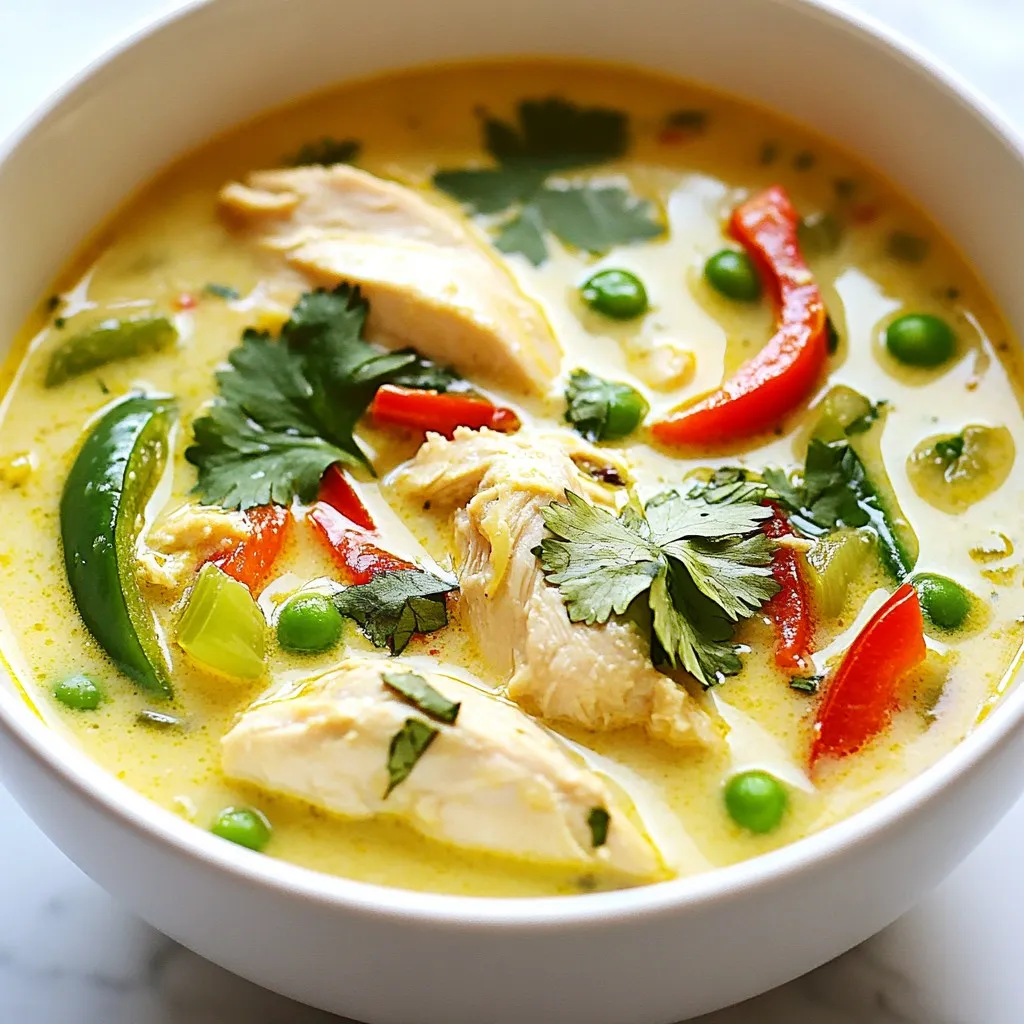 - Chicken and Broth Components - 1 lb boneless, skinless chicken thighs, diced - 4 cups chicken broth - 1 can (13.5 oz) coconut milk - Aromatics and Seasonings - 1 medium onion, finely chopped - 2 cloves garlic, minced - 1-inch piece of ginger, grated - 1 lime (zested and juiced) - 2 tablespoons fish sauce - 1 tablespoon brown sugar - 1 teaspoon red pepper flakes (adjust to taste) - Salt and pepper to taste - Vegetables and Garnishes - 1 red bell pepper, diced - 1 cup snap peas, trimmed - Fresh cilantro, for garnish The main stars of this soup are the chicken thighs, coconut milk, and broth. Chicken thighs are juicy and tender. The coconut milk gives a rich, creamy feel. The chicken broth adds depth to the flavors. For the aromatics, we use onion, garlic, and ginger. They bring warmth and a lovely fragrance. Lime zest and juice brighten up the dish, giving it a fresh taste. Fish sauce adds umami, while brown sugar balances the flavors. Red pepper flakes give a nice kick that you can adjust to your liking. The vegetables make it colorful and nutritious. Red bell pepper adds sweetness. Snap peas stay crisp and add a nice crunch. Finally, fresh cilantro on top makes the dish pop with flavor. Each ingredient plays a role in making this coconut lime chicken soup a delightful and tasty meal. {{ingredient_image_1}} Cooking the Chicken Start by heating a tablespoon of oil in a large pot over medium heat. Add the diced chicken thighs. Cook them for about 5 to 7 minutes until they are browned on all sides. This step builds flavor. Once done, remove the chicken from the pot and set it aside. Sautéing Aromatics In the same pot, add your chopped onion, minced garlic, and grated ginger. Cook for 3 to 4 minutes. You want the onion to be translucent and fragrant. This step adds depth to your soup. Combining Ingredients Next, pour in the coconut milk and chicken broth. Stir well to mix everything together. Add the lime juice and zest, fish sauce, brown sugar, and red pepper flakes. Bring this mixture to a gentle simmer. This is where the magic happens as the flavors meld together. Final Cooking Steps Return the browned chicken to the pot. Let it cook in the broth for about 10 minutes, uncovered. Then, add the diced red bell pepper and snap peas. Cook for another 5 minutes. You want the vegetables to be tender but still crisp. Finally, taste the soup and season with salt and pepper as needed. Adjust lime juice and red pepper flakes to suit your taste. Serve the soup hot, garnished with fresh cilantro. Enjoy your flavorful and simple Coconut Lime Chicken Soup! Ensuring Flavor Balance To make your coconut lime chicken soup taste great, balance is key. The sweet coconut milk needs the zesty lime. Adjust the lime juice to your taste. A little fish sauce adds depth. Taste as you go to find that perfect mix. Adjusting Spice Levels If you like heat, add more red pepper flakes. Start with a small amount. You can always add more if needed. For milder soup, skip the flakes or use less. Remember, spice affects the whole dish. Timing for Perfect Vegetables Add veggies like red bell peppers and snap peas last. This keeps them crisp and bright. Cook them just until tender, about five minutes. Overcooking makes them mushy. You want a nice bite in every spoonful. Pro Tips Use Fresh Ingredients: Fresh herbs and vegetables will enhance the flavor and overall quality of your soup. Adjust Spice Levels: Taste the soup as you go and adjust the red pepper flakes to suit your preference for heat. Let It Simmer: Allowing the soup to simmer longer can deepen the flavors, making it even more delicious. Garnish for Freshness: Adding fresh cilantro right before serving brightens the dish and adds a burst of flavor. {{image_2}} Vegetarian or Vegan Options You can make this soup without chicken. Use tofu or chickpeas instead. This change keeps the protein high. Use vegetable broth for a rich base. Also, swap fish sauce with soy sauce or tamari. Alternative Protein Choices If you prefer different meats, try shrimp or fish. Both cook quickly and add a nice taste. Just adjust cooking time to avoid overcooking. You can even use leftover roast chicken for a quick fix. Flavor Enhancements (Herbs & Spices) To add more flavor, think about fresh herbs. Basil, mint, or even Thai basil work well. You can also add lemongrass for a bright twist. Adjust red pepper flakes if you like more heat. Add a touch of curry powder for warmth. Don't be afraid to experiment with what you love! Refrigeration Guidelines After cooking, let your Coconut Lime Chicken Soup cool down. Transfer it to an airtight container. Store it in the fridge for up to three days. If you want to enjoy it later, make sure to keep it sealed. This keeps the flavors fresh. Freezing Instructions To freeze the soup, first cool it completely. Pour it into freezer-safe containers. Leave some space at the top because the soup will expand. You can freeze it for up to three months. When ready to eat, thaw it overnight in the fridge. Reheating Tips To reheat, you can use the stove or microwave. For stove reheating, pour the soup into a pot. Heat it on medium, stirring often until hot. If you use the microwave, heat it in short bursts. Stir in between to avoid hot spots. Always check the temperature before serving. Enjoy it warm! If you need a fish sauce substitute, use soy sauce or tamari. Both give a similar salty taste. If you want a more complex flavor, mix soy sauce with a bit of lime juice. This adds depth and keeps the dish bright. To make this soup spicier, add more red pepper flakes. Start with a little, then taste it. You can also use sliced fresh chili peppers for a fresh heat. Try jalapeños or Thai bird chilies to amp it up. Yes, you can use chicken breast instead of thighs. Chicken breast cooks faster, so check it early. Use the same cooking steps, but reduce the cooking time by a few minutes. Enjoy a leaner option while keeping the soup's flavor! In this blog post, we explored ke