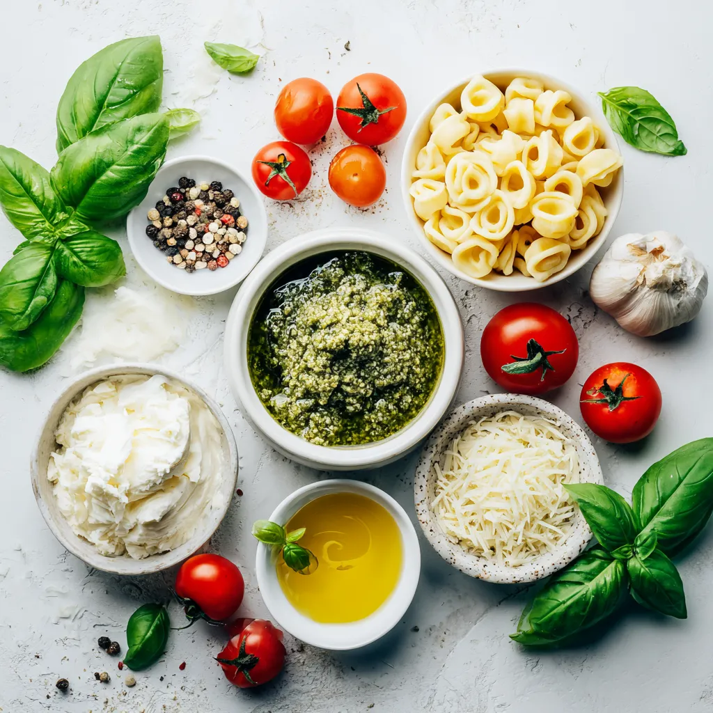 To make this creamy pesto tortellini, start with the main ingredients. Cheese tortellini brings a rich flavor. Heavy cream adds a smooth texture. Basil pesto gives that fresh herb taste we all love. Grated Parmesan cheese adds saltiness and depth.