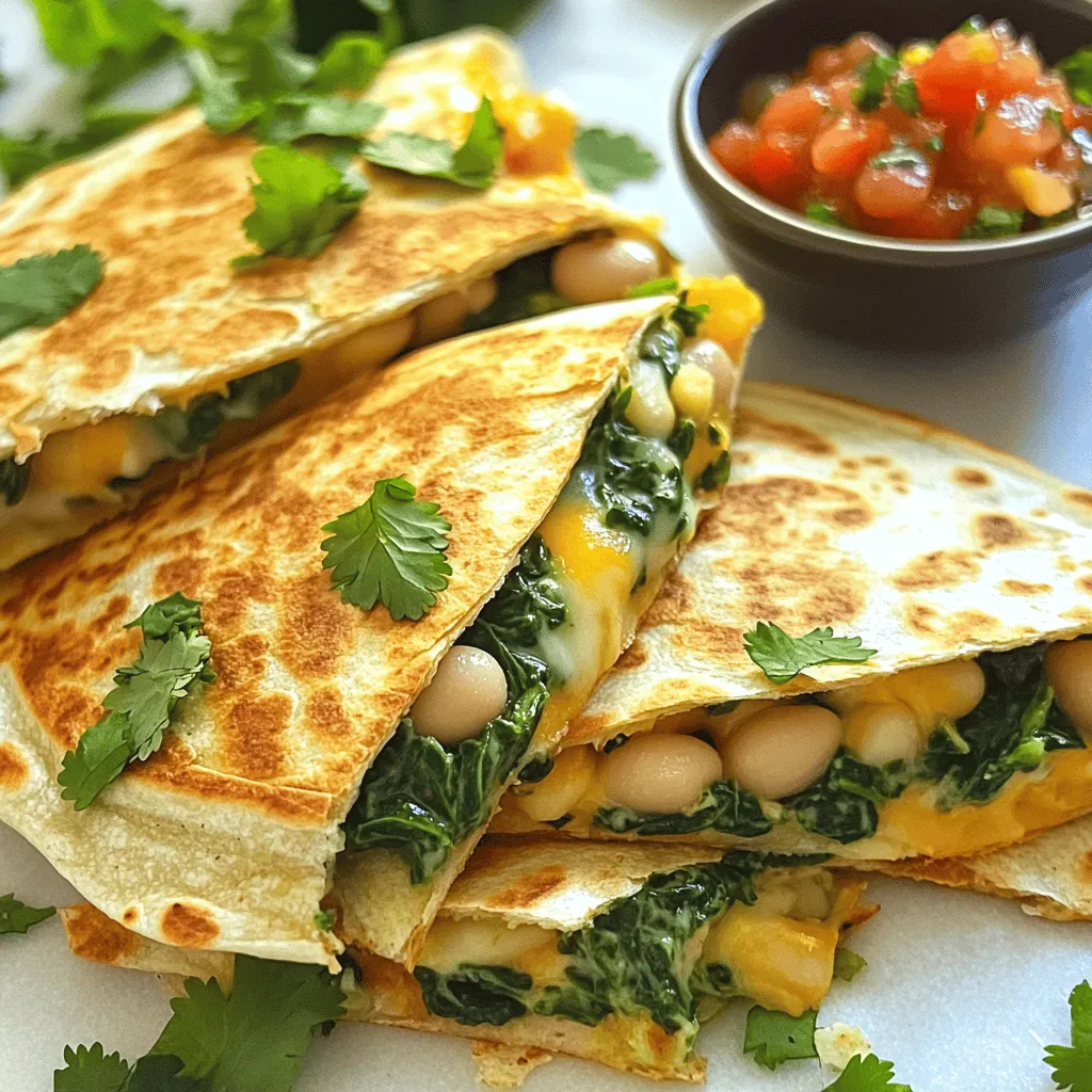 - 2 cups fresh spinach, chopped - 1 can (15 oz) white beans, drained and rinsed - 1 cup cream cheese, softened - ½ cup shredded mozzarella cheese - ½ cup grated Parmesan cheese - 2 cloves garlic, minced - 1 teaspoon onion powder - ½ teaspoon smoked paprika - Salt and pepper to taste - 4 large flour tortillas - Olive oil for frying Fresh spinach and white beans make this dish healthy and tasty. Spinach brings a bright green color and nutrients. White beans add creaminess and protein, making it filling. For the cheesy goodness, I use cream cheese, mozzarella, and Parmesan. Cream cheese gives a smooth texture, while mozzarella melts beautifully. Parmesan adds a nice salty kick. The minced garlic, onion powder, and smoked paprika bring the flavors to life. Don't forget salt and pepper for a bit of zing. - Additional vegetables - Protein options like chicken or tofu You can add more veggies for extra crunch. Try bell peppers, mushrooms, or zucchini. They will mix well with the creamy filling. If you want more protein, add cooked chicken or tofu. Both options work nicely and make the quesadillas heartier. This way, you can enjoy a meal that suits your taste. Start by chopping the fresh spinach. Aim for small pieces to mix well. Next, mince the garlic cloves finely, so they blend into the filling. In a mixing bowl, combine the chopped spinach, drained white beans, cream cheese, mozzarella cheese, Parmesan cheese, minced garlic, onion powder, smoked paprika, salt, and pepper. Use a fork or spatula to mix everything until it forms a creamy filling. This step is key for flavor and texture. Now, it's time to cook! Heat a large skillet over medium heat. Add a small drizzle of olive oil to ensure a nice, crispy texture. Place one tortilla in the skillet. Spoon a generous amount of that creamy filling onto one half of the tortilla. Fold the other half over to create a half-moon shape. Cook it for about 3 to 4 minutes. You want the bottom to turn golden brown and crispy. Carefully flip the quesadilla and cook the other side for another 3 to 4 minutes. This gives you a perfect crispy quesadilla. Repeat this process with the remaining tortillas and filling. Add more olive oil to the skillet as needed. Once all the quesadillas are cooked, take them out of the skillet. Let them cool for just a minute. This makes slicing easier. Cut the quesadillas into wedges for serving. For a fun touch, serve them warm with a side of salsa or guacamole. You can also garnish with fresh cilantro or a sprinkle of extra cheese. This adds color and flavor to your dish, making it even more appetizing. To get a great crisp, keep the frying temperature just right. Aim for medium heat. Too hot, and the outside burns while the inside stays cold. Too low, and you end up with a soggy quesadilla. Use about 1 to 2 tablespoons of olive oil per quesadilla. This amount coats the pan well without making it greasy. Extra virgin olive oil works best for flavor. To boost flavor, try adding spices like chili powder or cumin. These spices add depth and a little kick. Fresh herbs also make a big difference. Chopped cilantro or parsley adds a bright note to your filling. You could even mix in some chopped green onions for a fresh taste. If you plan to cook for more people, just increase your quantities. You can double or triple the filling easily. Make sure to use multiple skillets or cook in batches to keep everything warm. Each quesadilla takes about 3 to 4 minutes per side, so cooking in batches keeps things moving smoothly. Serve them hot, and they will be a hit! {{image_2}} You can easily make these quesadillas vegan. To do this, swap the cream cheese for a plant-based alternative. Many brands now offer tasty vegan cream cheese. This change keeps the creamy texture without dairy. You can also use gluten-free tortillas if you avoid gluten. This way, everyone can enjoy the dish without worry. The beauty of quesadillas is their flexibility. You can experiment with different cheeses, too. Try using sharp cheddar for a bolder taste, or pepper jack for some heat. Adding spices can also change the game. Consider mixing in cumin for warmth or chili powder for a kick. These small tweaks can create a whole new flavor profile. Think about adding traditional ingredients from different cuisines. For an Italian twist, toss in sun-dried tomatoes or basil. If you want a Mexican flair, add jalapeños or corn. Fusion ideas are fun! You could make a Mediterranean version by using feta and olives. Each variation opens up a world of delicious options. To keep your quesadillas fresh, store them in the fridge. Use an airtight container. This keeps the flavors strong. You can eat leftovers within three days. If you have more quesadillas, freezing is a good option. Wrap each one in foil or plastic wrap. Place them in a freezer bag. They will last for up to three months. Just label the bag with the date. This way, you know how long they have been frozen. When it's time to enjoy them again, reheating is key. To keep them crispy, use a skillet. Heat the skillet over medium heat. Place the quesadilla in the skillet for about 3-4 minutes on each side. This method keeps the outside crunchy. You can also use an oven. Preheat it to 375°F. Place the quesadillas on a baking sheet for 10-12 minutes. This method works well too. Just make sure they are hot all the way through. Yes, you can use frozen spinach. Here are the pros and cons: - Pros: Frozen spinach is easy to use and saves time. It’s often cheaper and lasts longer. - Cons: Frozen spinach has more water. It may affect the texture of your quesadillas. When using frozen spinach, thaw it first. Squeeze out extra water. Then, mix it with your other filling ingredients. Many sides go great with quesadillas. Here are some good options: - Salsa: A fresh tomato salsa adds flavor. - Guacamole: Creamy and rich, it complements the quesadillas well. - Salad: A simple green salad adds crunch and freshness. These sides have f