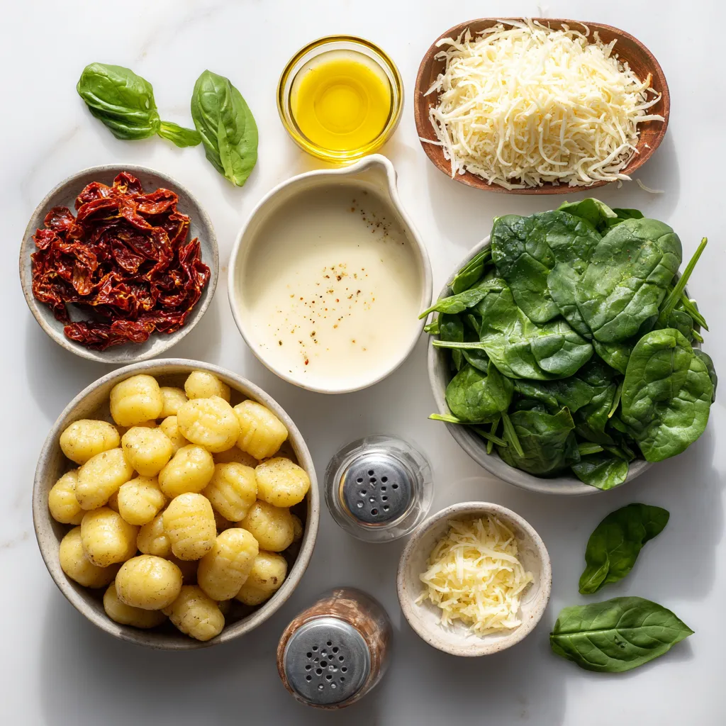 When making creamy sun-dried tomato gnocchi, gather your main ingredients first. This dish shines with soft gnocchi and rich sun-dried tomatoes. You need heavy cream for a thick sauce, and Parmesan cheese adds depth.