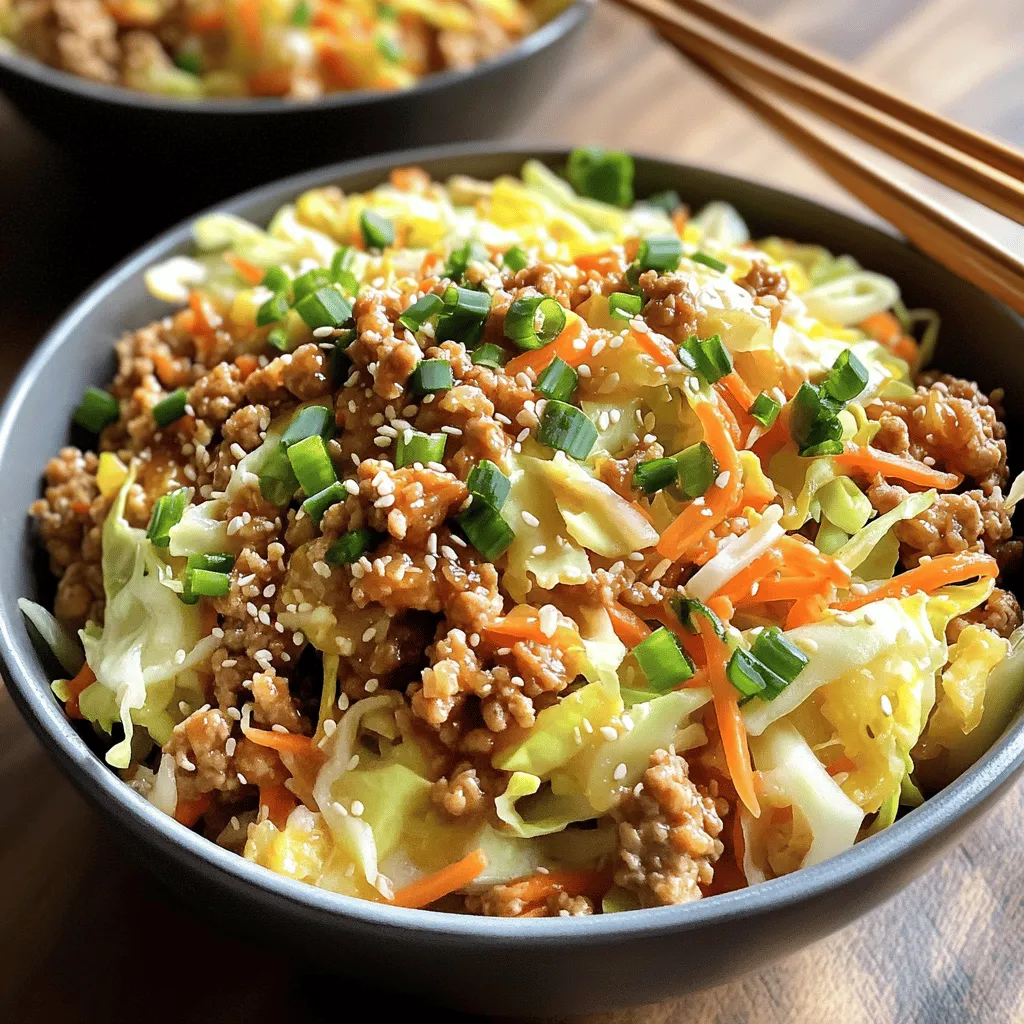 You can enhance your Egg Roll in a Bowl by adding more vegetables. Try bell peppers, snap peas, or mushrooms for extra crunch. Zucchini or broccoli can be great too. These veggies not only add color but also boost nutrition. For toppings, consider adding chopped cilantro or crunchy peanuts. These add a fresh taste and a fun texture. A squeeze of lime on top can also brighten the flavors.