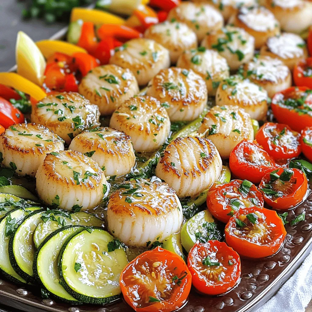 For plating, serve the scallops and veggies on a large platter. Drizzle any garlic butter left in the pan over the top. This adds richness and flavor. Garnish with lemon wedges for a bright touch and extra flavor. Enjoy your delicious meal!