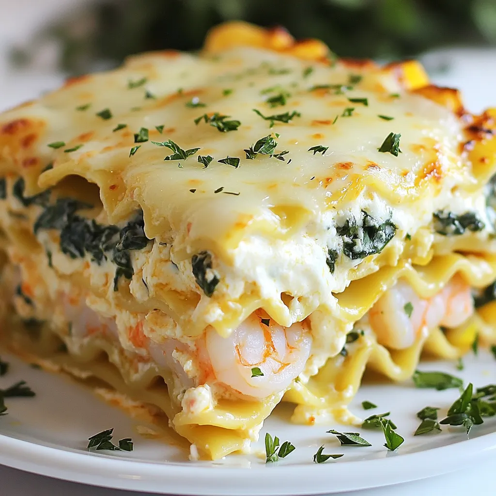 Layering is key to a great lasagna. Start with a thin layer of cream sauce on the bottom. Place three lasagna noodles next. Add half of the shrimp and half of the spinach. Spread another layer of sauce over that. Repeat this process. Finish with three noodles and the last of the sauce. Top it off with mozzarella cheese. This helps create a creamy and tasty dish.