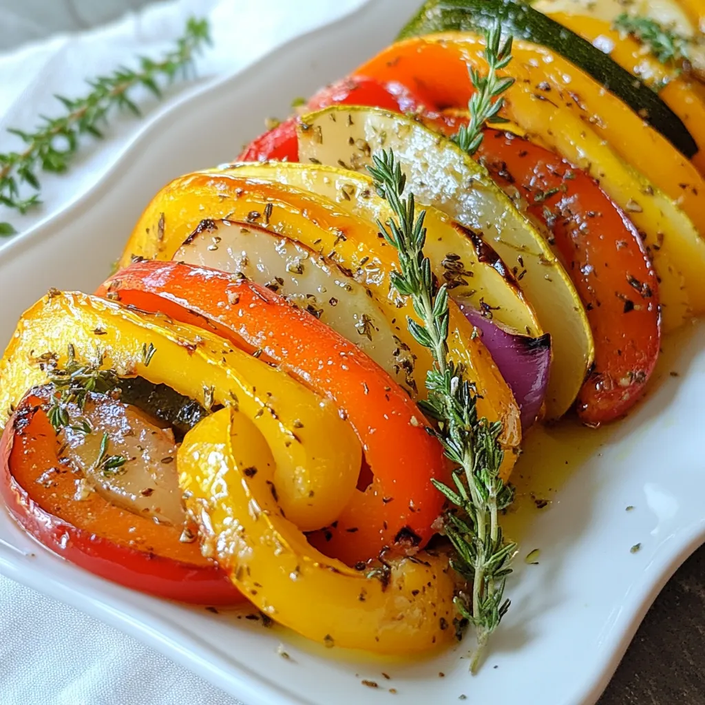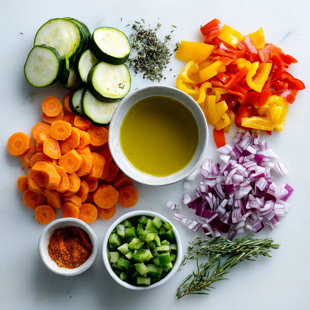 For this dish, I use a mix of fresh vegetables. They add color and flavor. Here are the main ones: - 2 cups carrots, sliced - 2 cups bell peppers (red, yellow, green), chopped - 2 cups zucchini, sliced - 1 cup red onion, chopped Herbs and spices make this dish pop. They bring out the natural sweetness of the vegetables. Here’s what you need: - 4 cloves garlic, minced - 1 tablespoon fresh rosemary, chopped - 1 tablespoon fresh thyme, chopped - 1 teaspoon smoked paprika - Salt and pepper to taste Olive oil is key for roasting. It helps the vegetables cook and adds richness. You will need: - 3 tablespoons olive oil Using these ingredients together creates a tasty side dish. You can mix and match vegetables, but this combo works best. {{ingredient_image_1}} Start by washing the vegetables well. This helps to remove dirt and germs. Next, slice the carrots into thin rounds. Chop the bell peppers into bite-sized pieces. For the zucchini, slice it into half-moons. Finally, chop the red onion into small pieces. Place all these vegetables in a large mixing bowl. This mix will give a nice variety of colors and textures. In a small bowl, add four minced garlic cloves. Pour in three tablespoons of olive oil. Then, add one tablespoon each of chopped rosemary and thyme. Sprinkle in one teaspoon of smoked paprika, salt, and pepper. Use a whisk to mix everything well. This herb oil will add great flavor to your veggies. Preheat your oven to 425°F (220°C). Once it’s ready, pour the herb oil over the vegetables. Toss them gently to coat every piece. Line a baking sheet with parchment paper for easy cleanup. Spread the vegetables in one layer on the sheet. This helps them cook evenly. Roast in the oven for 25 to 30 minutes. Stir them halfway through for even cooking. The veggies are done when they are tender and slightly caramelized. Remove them from the oven and let them cool for a few minutes before serving. To get great roasted vegetables, start with fresh ones. Fresh veggies taste better and roast nicely. Cut your vegetables into similar sizes. This helps them cook evenly. Spread them out on the baking sheet. Don’t crowd them, or they will steam instead of roast. Stir halfway through to help with even cooking. You want them golden and tender. Want to mix things up? Add different veggies like broccoli or sweet potatoes. You can also try new herbs. Basil or oregano can give a fresh twist. For a spicy kick, add red pepper flakes. If you love citrus, try squeezing lemon juice over them before serving. This adds brightness and flavor. Serve these roasted vegetables warm. They make a great side for meat or fish. You can also toss them into salads or grain bowls. For a colorful platter, mix with fresh herbs. A drizzle of balsamic glaze can add a nice touch too. Enjoy these veggies in any meal! Pro Tips Choose Fresh Vegetables: Select vibrant, seasonal vegetables for the best flavor and nutrition. Uniform Cutting: Cut all vegetables into similar sizes to ensure even roasting and cooking. Don't Crowd the Pan: Spread the vegetables out on the baking sheet to allow for proper browning and caramelization. Flavor Boost: Experiment with different herbs and spices to customize the flavor profile to your liking. {{image_2}} You can swap out the vegetables based on your taste. Broccoli, sweet potatoes, and cauliflower work well. Consider using asparagus or Brussels sprouts for variety. Each will bring its unique flavor. You can even mix in some cherry tomatoes for a pop of sweetness. Herbs can change the flavor of your dish. Try using basil or oregano for a fresh taste. Sage pairs nicely with root veggies like carrots and potatoes. Cilantro adds a bright touch, especially with bell peppers. Experiment with what you have available to discover your favorites. This recipe is already vegan and gluten-free. You can keep it that way by using the right oils and spices. Just make sure to check labels on pre-made spice blends. Fresh herbs and oil give a great taste without any allergens. Enjoy this dish with confidence, knowing it fits many diets. After enjoying your garlic herb roasted vegetables, let them cool down. Place them in an airtight container. This helps keep them fresh. Store them in the fridge. They will last about 3 to 5 days. Avoid mixing them with other foods to keep flavors separate. When you reheat your vegetables, aim for the oven or air fryer. This method helps regain their crispness. Preheat the oven to 350°F (175°C). Spread the vegetables on a baking sheet. Heat for about 10-15 minutes. Stir halfway to ensure even warmth. If using an air fryer, set it to 350°F for 5-7 minutes. You can freeze garlic herb roasted vegetables for later use. First, let them cool completely. Place them in freezer bags or containers. Remove as much air as possible. They will last about 2 to 3 months in the freezer. When you're ready to eat, thaw in the fridge overnight before reheating. Yes, you can use frozen vegetables. They are quick and easy. Just make sure to thaw them first. Pat them dry to remove excess moisture. This helps them roast better. Keep in mind that frozen veggies may cook faster. Check them often to avoid overcooking. The best way to season roasted vegetables is to use fresh herbs and spices. This recipe uses garlic, rosemary, and thyme. These add a great flavor. You can also use smoked paprika for a nice touch. Salt and pepper are essential too. They enhance the natural taste of the veggies. Mix your seasonings well with olive oil before tossing them with the veggies. This ensures even coating. You can prepare the vegetables a day in advance. Cut and chop them, then store in the fridge. You can also mix the herb oil and store it separately. When you are ready to cook, just combine them and roast. This saves you time on busy days. Enjoy delicious garlic herb roasted vegetables whenever you want! Roasting vegetables is simple and fun. We explored the best veggies, herbs, and spices to use. You learned 