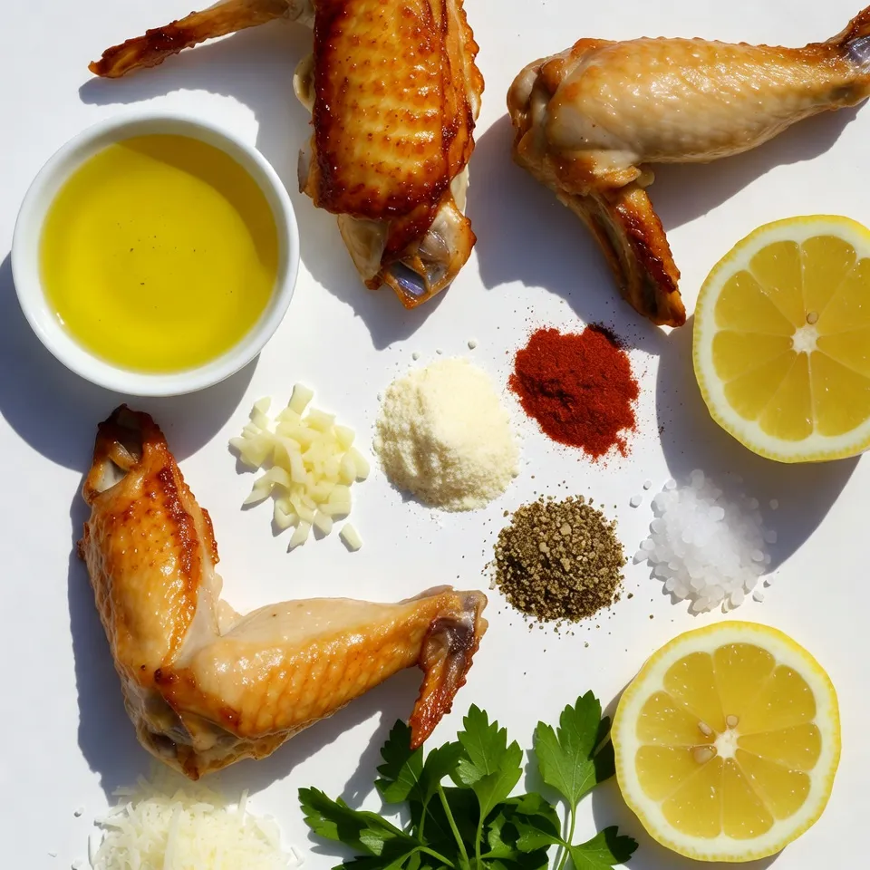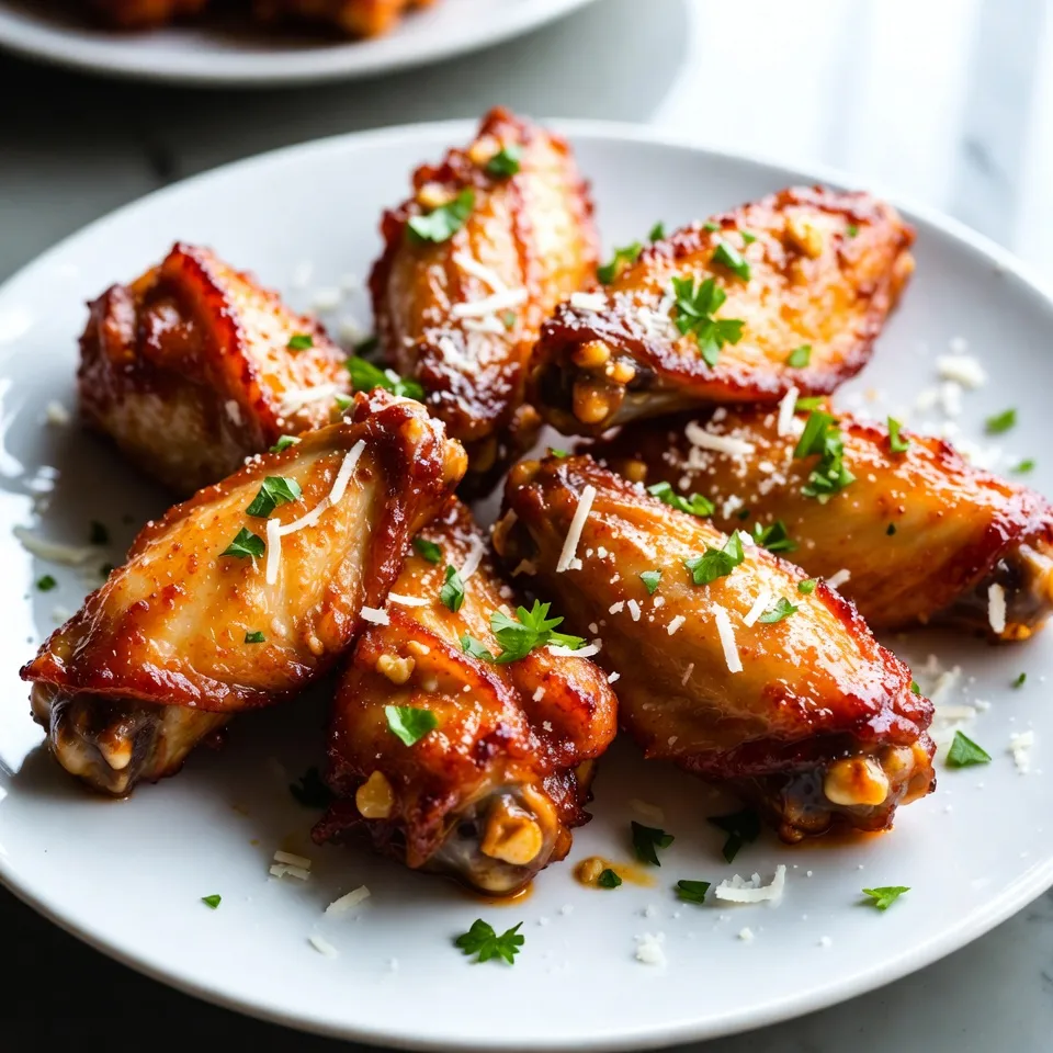 - 2 lbs chicken wings - 4 tablespoons olive oil - 6 cloves garlic, minced - 1 teaspoon onion powder - 1 teaspoon paprika - 1 teaspoon salt - ½ teaspoon black pepper - 1 cup grated Parmesan cheese - 2 tablespoons finely chopped fresh parsley Use a kitchen scale to measure 2 lbs of chicken wings. This ensures you have enough for everyone. For the olive oil, use a standard tablespoon measuring spoon to get 4 tablespoons. Mince 6 cloves of garlic finely for the best flavor. When measuring dry spices, like onion powder and paprika, use a teaspoon. This gives you the right balance of taste. The same goes for salt and black pepper. Finally, for Parmesan, grate it fresh for a rich taste. You can also buy pre-grated cheese if you prefer speed. - Lemon wedges Lemon adds a bright kick to the wings. You squeeze it on right before eating. It enhances the garlic and cheese flavors. If you want a fresh touch, lemon is a great choice. It’s simple and brings out the best in your dish. {{ingredient_image_1}} First, make sure to preheat your air fryer to 400°F (200°C). This step helps to cook the wings evenly. Next, take the chicken wings and pat them dry using paper towels. This removes extra moisture, making the wings crispier when cooked. In a large bowl, mix together the olive oil, minced garlic, onion powder, paprika, salt, and black pepper. Stir well to combine all the ingredients. This mixture creates a rich flavor that will soak into the wings. Add the chicken wings to the bowl with the marinade. Toss them well so every wing gets coated with the tasty mix. Then, place the wings in a single layer in the air fryer basket. You might need to fry them in batches if your basket is small. Cook the wings for 25 to 30 minutes. Shake the basket halfway through to ensure even cooking. When they turn golden brown and crispy, they are ready. After cooking, move the wings to a large bowl. While they are hot, sprinkle the grated Parmesan cheese on top. Toss the wings to coat them evenly in cheese. Finally, garnish with chopped parsley and serve with lemon wedges for a fresh taste. To get crispy wings, start with dry chicken. Pat them with paper towels before you season. This helps the skin crisp up well. Use your air fryer at 400°F (200°C). This high heat makes the wings golden and crunchy. Make sure to toss the wings halfway through cooking. This ensures even cooking and crispiness on all sides. To boost flavor, use fresh garlic. It adds a strong, rich taste. You can also add more spices like cayenne for heat or smoked paprika for a deep flavor. Tossing the wings in Parmesan while they are hot helps the cheese stick. You can garnish with fresh parsley for a pop of color and taste. Lemon wedges on the side add a bright, zesty touch. Cooking wings takes time but is worth it. Air fry them for 25 to 30 minutes. Check if they are golden brown. If they need more time, add a few more minutes. Each air fryer is different, so keep an eye on them. For best results, cook in batches so the wings do not crowd the basket. This allows hot air to circulate, which keeps them crispy. Pro Tips Dry the Wings: Make sure to pat the chicken wings dry thoroughly before marinating. This will help them achieve a crispier texture when air-fried. Marinate Longer: If time allows, marinate the chicken wings for at least 30 minutes or even overnight in the refrigerator. This will enhance the flavor dramatically. Don’t Overcrowd: When placing the wings in the air fryer, ensure they are in a single layer. Overcrowding can lead to uneven cooking and less crispy wings. Toss with Extra Parmesan: For an additional cheesy flavor, consider tossing the wings with extra Parmesan cheese after air frying for a deliciously rich finish. {{image_2}} For a kick, add spicy seasonings. Mix in 1-2 teaspoons of cayenne pepper or chili powder into your marinade. This spice makes the wings hot and flavorful. After air frying, sprinkle extra Parmesan for a crunchy bite. Serve with blue cheese dressing to cool down the heat. For a sweet twist, add honey to your marinade. Combine 2-3 tablespoons of honey with the olive oil and garlic. This gives the wings a nice glaze. The honey balances the savory taste of the Parmesan. These wings pair great with a side of fresh veggies. To make these wings fresh and bright, mix in herbs. Add 1-2 teaspoons of dried oregano or thyme to your marinade. You can also use fresh herbs, like rosemary or basil, finely chopped. This makes the wings smell amazing and adds depth to the flavor. The herbs work perfectly with the garlic and Parmesan mix. After you enjoy your garlic Parmesan wings, store any leftovers in an airtight container. Let them cool to room temperature first. This keeps them fresh. Place the container in the fridge. They should stay good for up to three days. To reheat your wings, preheat your air fryer to 375°F (190°C). Place the wings in a single layer in the basket. Heat them for about 5 to 7 minutes. This method keeps them crispy. You can also use the oven. Set it to 350°F (175°C) and bake for 10 to 15 minutes. You can freeze cooked wings for a tasty snack later. Let the wings cool completely. Place them in a freezer-safe bag. Remove as much air as possible before sealing. They can last for up to three months in the freezer. When you’re ready to eat, thaw them in the fridge overnight before reheating. To make air fryer wings crispy, dry the wings well before cooking. Moisture can lead to soggy wings. Use a paper towel to pat them dry. Then, coat them in olive oil and your favorite seasonings. The oil helps the skin crisp up in the air fryer. Cooking at a high temperature, like 400°F, also helps a lot. Shake the basket halfway through to ensure even cooking. Yes, you can use frozen chicken wings. However, you should thaw them first for best results. If you cook from frozen, increase the cooking time by about five to ten minutes. Check their internal temperature to ensure they reach 165°F. Remember to dr