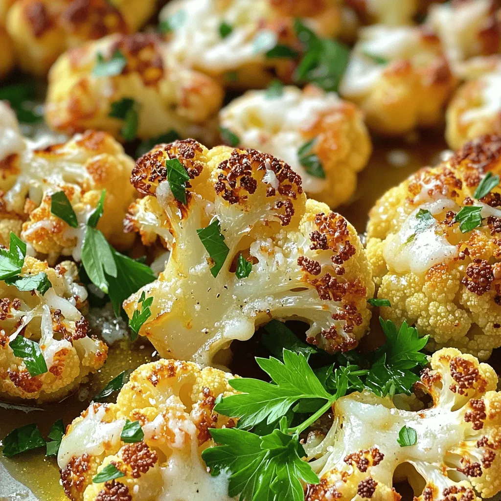 Once the cauliflower is roasted, take it out of the oven. Sprinkle 1/4 cup of grated Parmesan cheese over the hot cauliflower. This cheese melts beautifully. Return the baking sheet to the oven for another 5 minutes. This helps the cheese become bubbly and golden. When it’s ready, let it cool for a minute. Garnish with fresh parsley and extra Parmesan if you like. This adds a nice touch and flavor. Enjoy your Garlic Parmesan Roasted Cauliflower as a perfect side dish!
