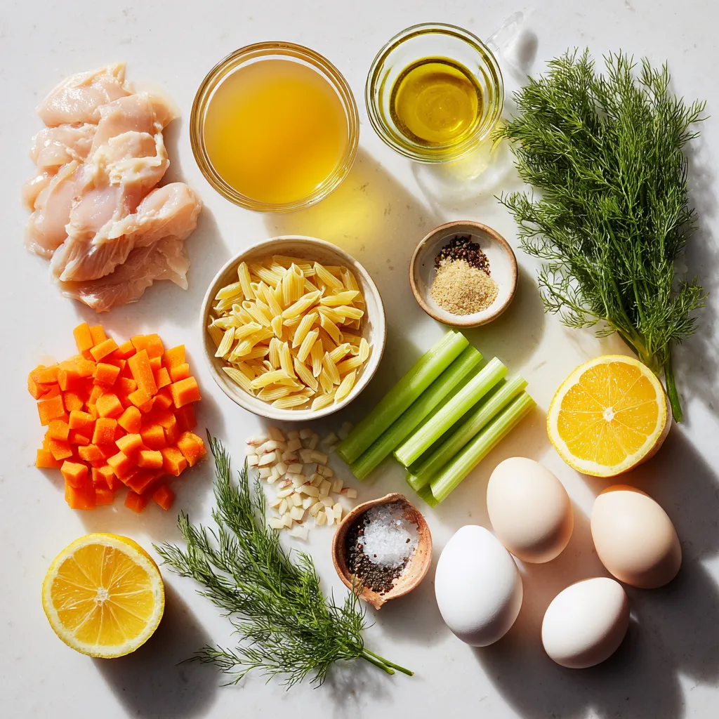 To make Greek lemon chicken soup, you need fresh, simple ingredients. The chicken gives the soup its heartiness. The broth adds depth of flavor. Onions, garlic, carrots, and celery give it a fresh taste. Orzo pasta makes it filling. Eggs and lemon juice create a creamy, tangy base. Dill finishes the dish with a burst of freshness.