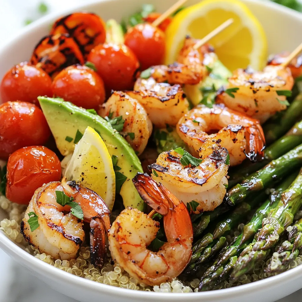 Once everything is cooked, remove it from the grill and let it cool a bit. In serving bowls, start with a layer of cooked quinoa or rice. Top each bowl with grilled shrimp, asparagus, cherry tomatoes, and avocado slices. Finish with fresh parsley and serve lemon wedges on the side for a burst of flavor. Enjoy your meal!