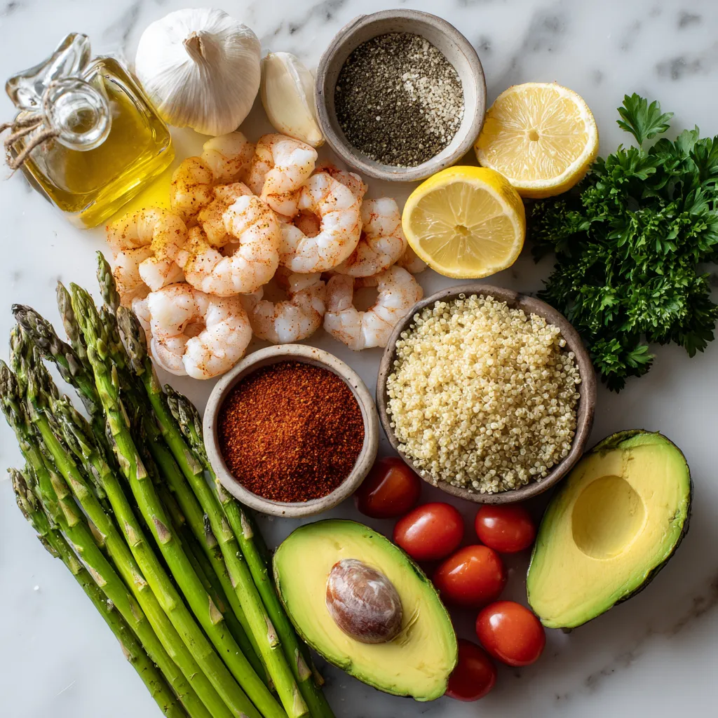 This dish is packed with healthy ingredients. Shrimp provides protein and omega-3 fatty acids. Asparagus is high in vitamins A, C, and K. Quinoa or rice adds fiber and carbs for energy. The avocado gives you healthy fats, while tomatoes add antioxidants. Overall, this meal is nutritious and balanced!