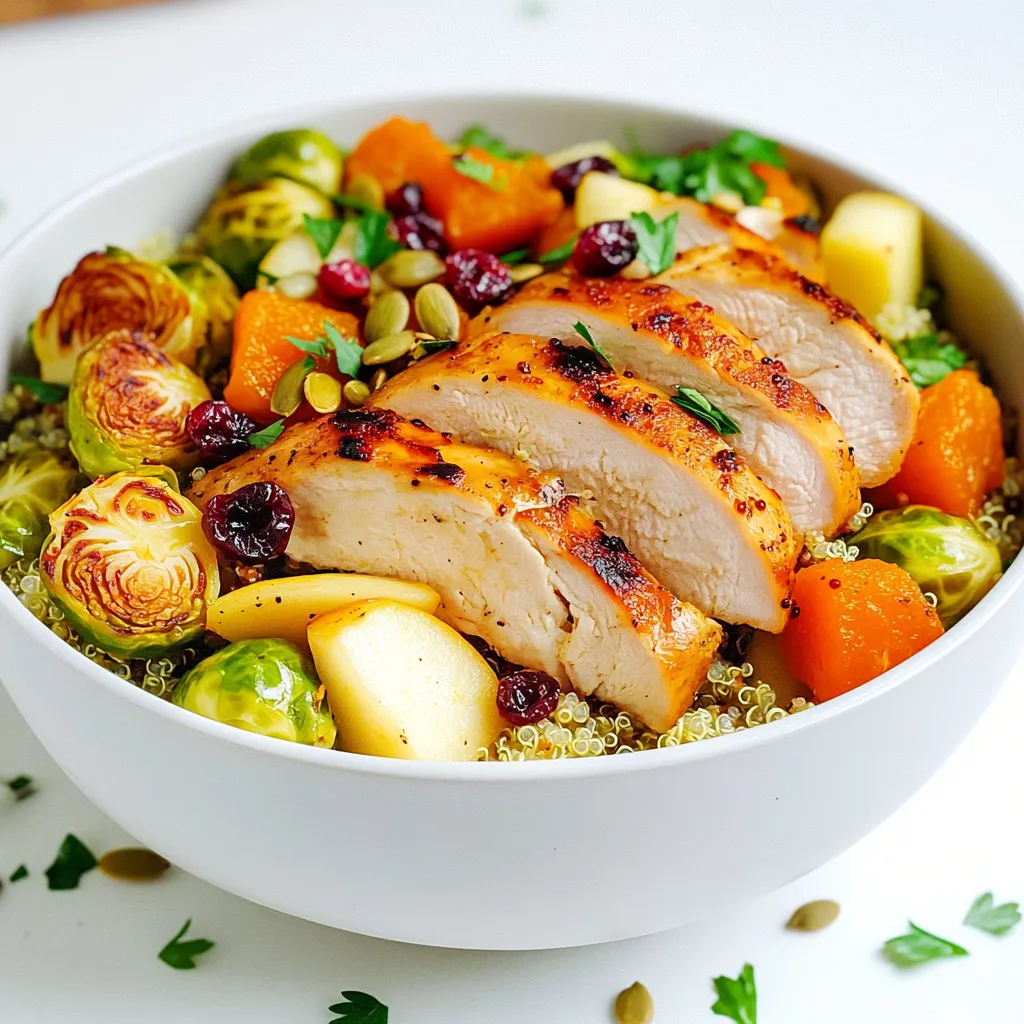You need fresh, quality ingredients for the best flavor. I love using chicken breasts for their tender meat. Quinoa is my go-to grain. It cooks up fluffy and adds protein. Seasonal veggies, like butternut squash and Brussels sprouts, provide great taste and color. Honeycrisp apples add a sweet crunch, while dried cranberries bring a tangy note. Lastly, pumpkin seeds give a nice crunch and healthy fats.