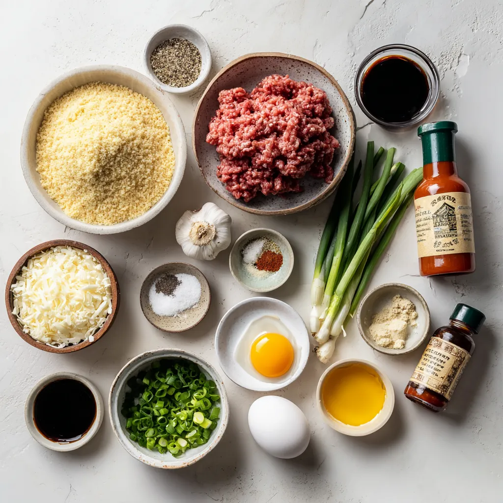 - In a large bowl, combine the ground beef (or turkey), breadcrumbs, grated Parmesan, chopped green onions, egg, minced garlic, salt, pepper, and onion powder. Mix until just combined, being careful not to overmix.