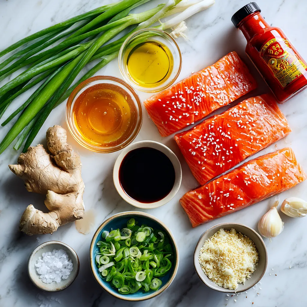 These main ingredients come together to make a sweet and spicy glaze for the salmon. The honey adds sweetness, while the Sriracha brings heat. The garlic and ginger give it depth, making every bite flavorful.
