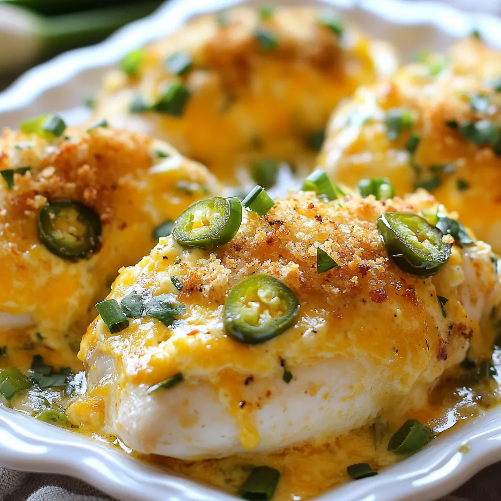 A delicious baked chicken dish stuffed with a creamy jalapeño cheese filling, topped with crispy breadcrumbs.