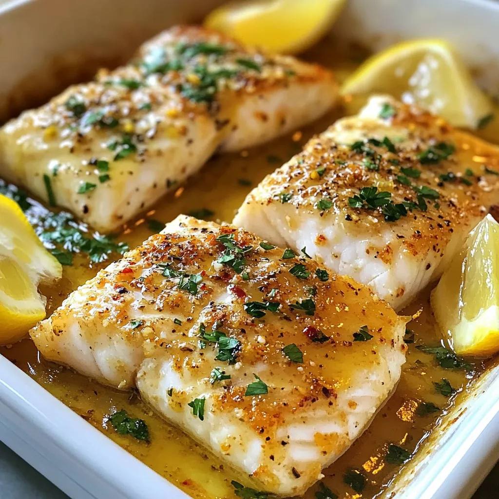 To make Lemon Garlic Butter Cod, you need a few key items. Here’s what you’ll need: - 4 cod fillets (about 6 ounces each) - 4 tablespoons unsalted butter - 4 cloves garlic, minced - Juice of 1 lemon - Zest of 1 lemon - 1 teaspoon dried thyme - 1 teaspoon smoked paprika - Salt and pepper to taste You can elevate your dish with some extra touches. Consider these garnishes and sides: - Fresh parsley, chopped (for garnish) - Lemon wedges (for serving) These additions bring color and a burst of flavor. If you don’t have some ingredients, don’t worry! Here are some easy swaps: - Use olive oil instead of butter for a lighter option. - Swap cod for another white fish like tilapia or haddock. - If you don’t have fresh lemon, bottled lemon juice works in a pinch. - Dried herbs can replace fresh ones if that’s what you have. Feel free to get creative and make this dish your own! {{ingredient_image_1}} First, preheat your oven to 400°F (200°C). This step is key for even cooking. While the oven heats up, prepare your baking dish. You can line it with parchment paper. This will help the cod not to stick. If you prefer, lightly grease the dish with oil. Next, pat the cod fillets dry with paper towels. This helps the sauce stick better. Now, let’s make the lemon garlic butter sauce. Take a small saucepan and place it over medium heat. Add 4 tablespoons of unsalted butter. Watch closely as it melts. Once the butter is melted, add 4 cloves of minced garlic. Sauté this for about 1-2 minutes. You want the garlic to smell good but not burn. After that, remove the saucepan from the heat. Stir in the juice and zest of 1 lemon. Next, add 1 teaspoon of dried thyme and 1 teaspoon of smoked paprika. Finally, season with salt and pepper to taste. This sauce is what makes the cod so special. Now it’s time to bake the cod. Place the fillets in the prepared baking dish. Pour the lemon garlic butter sauce evenly over the fillets. Make sure each piece is well covered. Then, place the baking dish in the oven. Bake the cod for 12-15 minutes. It will be done when it flakes easily with a fork. The fish should also look opaque. Once cooked, take it out of the oven. Garnish with fresh parsley for a pop of color. Serve with lemon wedges for an extra citrusy kick. To cook cod well, you need to start with fresh fillets. Look for fish that feels firm and has a clean smell. When cooking, pat the fish dry to help it brown nicely. Always preheat your oven to 400°F (200°C). This ensures even cooking. Bake cod for 12-15 minutes. It should flake easily with a fork when done. Avoid overcooking, as this can make the fish tough. You can boost the flavor of your Lemon Garlic Butter Cod easily. Try adding fresh herbs like dill or basil for a fresh twist. A sprinkle of red pepper flakes can add a nice kick. You can also mix in some capers for a briny touch. If you like a richer taste, consider adding a splash of white wine to the butter sauce. This will deepen the flavor profile and make it even more delightful. Lemon Garlic Butter Cod pairs well with many sides. Serve it with roasted vegetables for a healthy meal. Mashed potatoes or rice provide a nice base too. A crisp salad with lemon vinaigrette complements the cod well. For a refreshing drink, lemon-infused iced tea or a light white wine goes perfectly. Don't forget lemon wedges on the side for extra zest! Pro Tips Use Fresh Ingredients: Fresh cod and garlic will elevate the flavor of your dish significantly compared to frozen or pre-minced options. Check for Doneness: Cod is perfectly cooked when it flakes easily with a fork and is opaque throughout. Avoid overcooking to keep it moist. Experiment with Herbs: Feel free to substitute or add different herbs like dill or parsley for unique flavor profiles. Serve with Sides: Pair the cod with steamed vegetables or a light salad for a balanced meal. {{image_2}} You can jazz up your cod with fresh herbs. Try using dill, parsley, or basil. These herbs add a nice touch. Simply chop them finely and mix them into the lemon garlic butter sauce. This gives the fish a bright and fresh flavor. You can also sprinkle herbs on top before serving. This adds color and taste. Make this dish a full meal by adding veggies. I love using asparagus, bell peppers, or green beans. Cut them into bite-sized pieces and place them around the cod in the baking dish. Toss the veggies in the lemon garlic butter mixture. They will cook perfectly with the fish. This makes for an easy, tasty, and healthy one-pan meal. You can cook cod in different ways. Grilling gives the fish a nice smoky flavor. Brush the cod with the lemon garlic butter and grill for about 3-4 minutes on each side. If you prefer pan-searing, heat a skillet over medium-high heat. Add butter and garlic, then place the cod in the pan. Cook for about 4 minutes on each side until golden brown. Both methods keep the fish moist and full of flavor. To store leftover cod, let it cool first. Place it in an airtight container. Make sure to cover it well. This helps keep the fish fresh. You can store it in the fridge for up to 2 days. If you want it to last longer, consider freezing it. Reheat your cod gently to keep it moist. Preheat your oven to 350°F (175°C). Place the cod in a baking dish. Add a splash of water or lemon juice to keep it moist. Cover the dish with foil and heat for about 10-15 minutes. You can also use a microwave. Heat it for 1-2 minutes, checking often. To freeze cod, wrap each fillet tightly in plastic wrap. Then, place them in a freezer bag. Remove as much air as you can. Label the bag with the date. You can freeze cod for up to 3 months. When ready to eat, thaw it overnight in the fridge. You can tell cod is cooked when it flakes easily with a fork. The fish should look opaque all the way through. Use a food thermometer if you want to be exact. The safe internal temperature for fish is 145°F (63°C). Check the thickest part of the fillet for the best results. Keep an