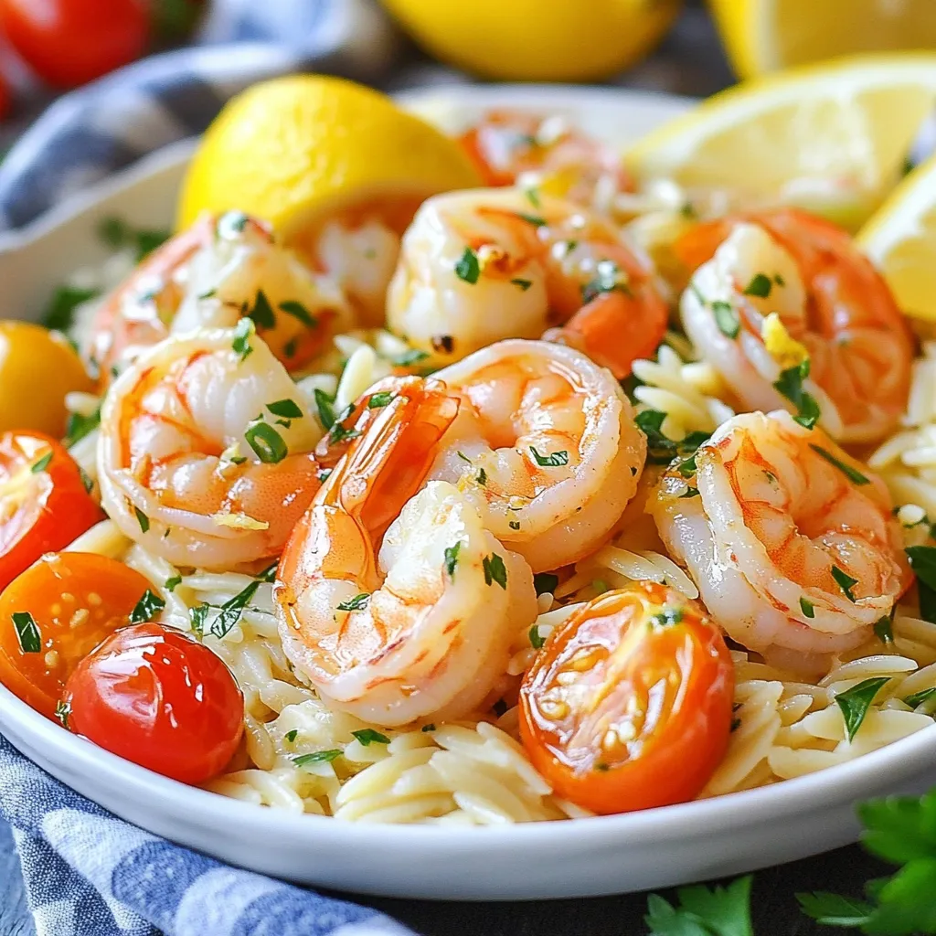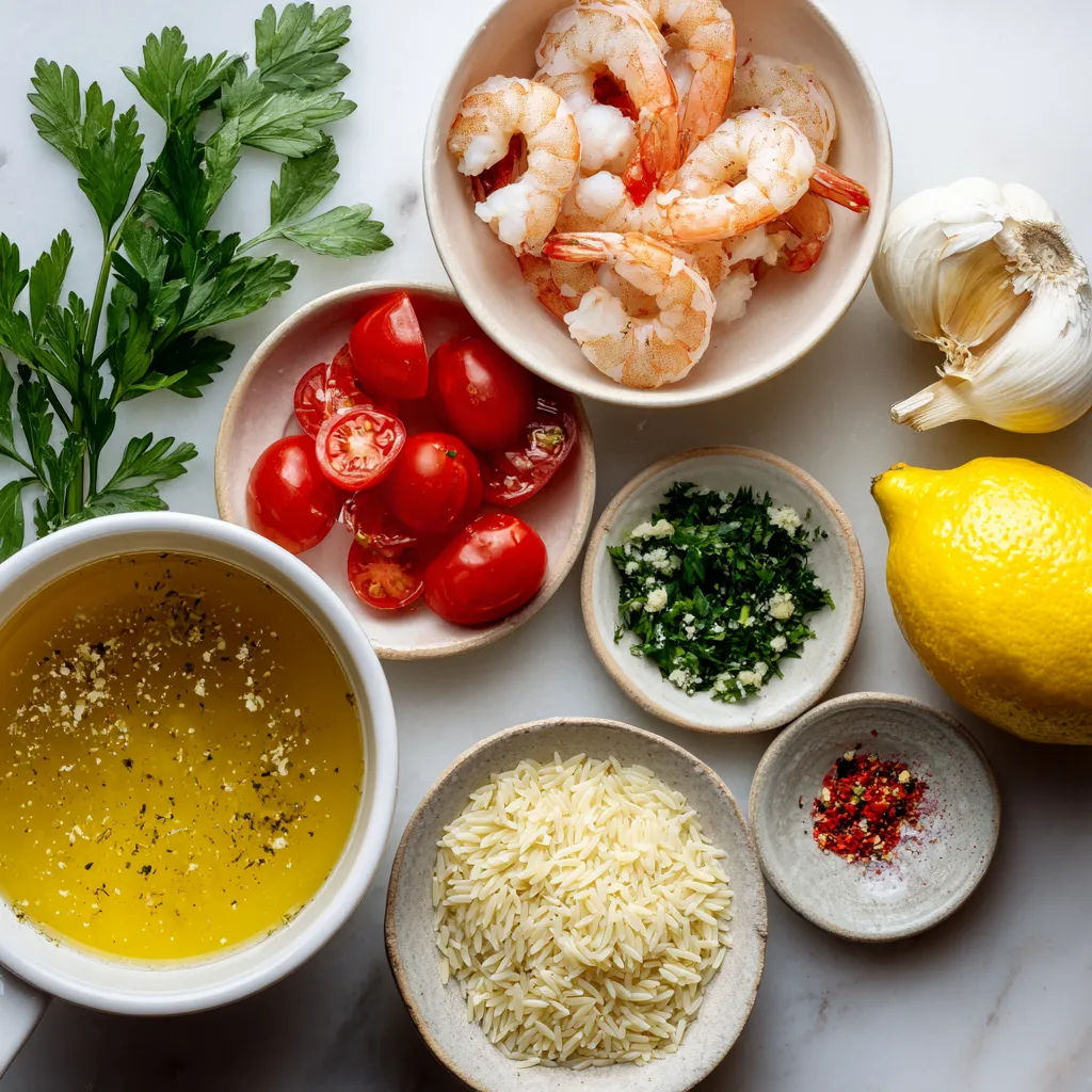 For the flavor enhancers, olive oil gives richness. It helps cook shrimp and garlic to perfection. The lemon zest and juice brighten the dish. They add a fresh, tart note that wakes up your taste buds. Vegetable broth gives depth and helps the orzo cook well.