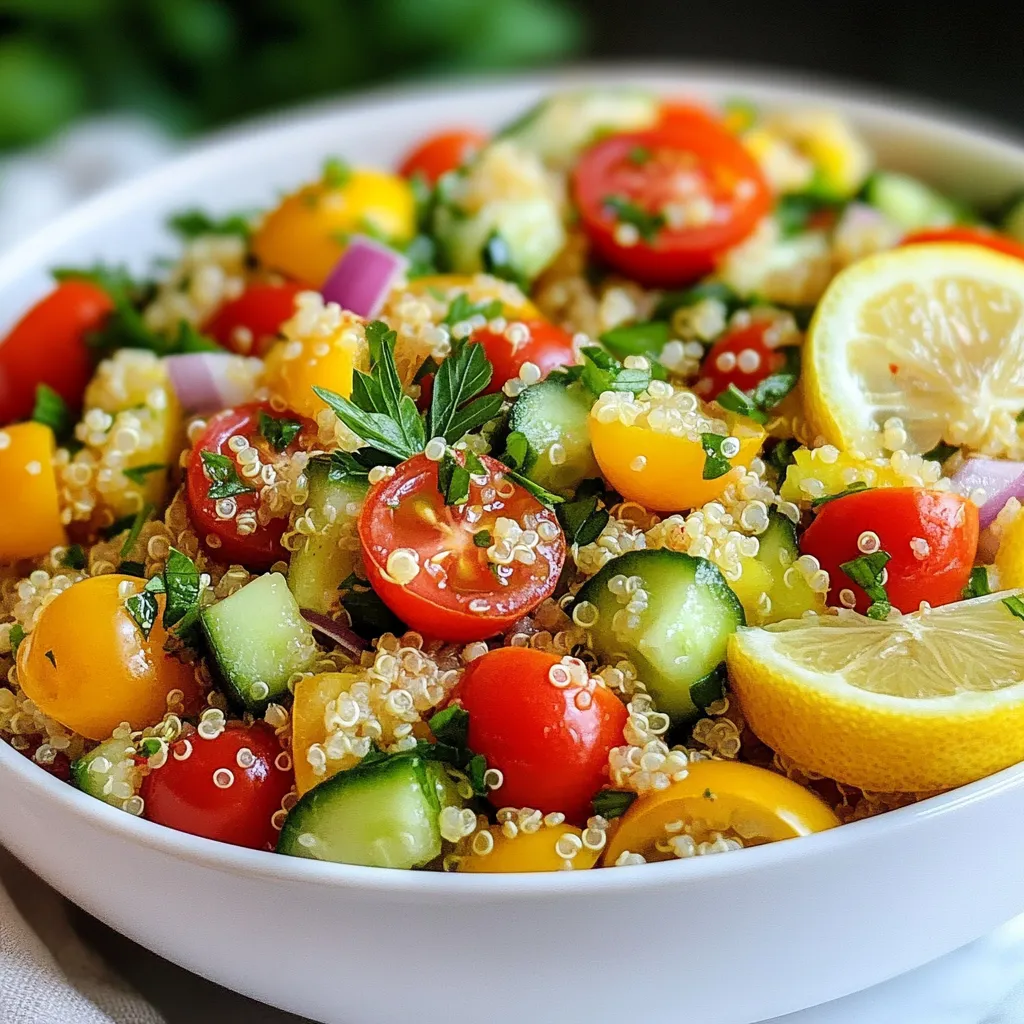- 1 cup quinoa, rinsed - 2 cups vegetable broth or water - 1 cup cherry tomatoes, halved - 1 cucumber, diced - 1 bell pepper (any color), diced - 1/4 red onion, finely chopped - 1/4 cup fresh parsley, chopped - 1/4 cup fresh mint leaves, chopped Quinoa is the star of this dish. It is light and fluffy. Rinsing it removes the bitter coating. I use vegetable broth for flavor, but water works too. The veggies add color and crunch. Cherry tomatoes bring sweetness. Cucumber and bell pepper add freshness. Red onion gives a subtle bite. Fresh herbs, like parsley and mint, brighten the salad. - Juice of 1 lemon - 3 tablespoons olive oil - Salt and pepper to taste The dressing is simple yet tasty. Fresh lemon juice adds zing. Olive oil brings richness. I always adjust seasoning with salt and pepper. This helps balance the flavors. - Additional herbs - Citrus garnishes For extra flair, I suggest adding more herbs. Chopped basil or dill can work well. Citrus slices not only look good but also add flavor. They can brighten each bite of the salad. {{ingredient_image_1}} First, you need to rinse the quinoa. This step washes away the bitter coating called saponin. Place the quinoa in a fine-mesh strainer under cold water. Rub and swish it with your hand for about 30 seconds. Drain well. Next, combine the rinsed quinoa and 2 cups of vegetable broth or water in a medium saucepan. Bring it to a boil over high heat. Once boiling, reduce the heat to low, cover the pot, and let it simmer. Cook for about 15 minutes until the quinoa is fluffy and all the liquid is gone. After that, remove it from heat. Let it sit covered for 5 minutes. Fluff it with a fork and allow it to cool. While the quinoa cools, it’s time to chop the veggies. Start with the cherry tomatoes. Cut them in half. For the cucumber, slice it in half lengthwise, then dice it into small pieces. Do the same for the bell pepper. Remove the seeds first, then chop it into small cubes. Now, finely chop the red onion. Use a sharp knife for clean cuts. Lastly, chop the parsley and mint. This will add fresh flavor to your salad. In a large mixing bowl, add the cooled quinoa. Then toss in the cherry tomatoes, cucumber, bell pepper, red onion, parsley, and mint. This mix of colors and textures makes it beautiful. Next, whisk together the lemon juice, olive oil, salt, and pepper in a small bowl. Mix until it is smooth. Pour this dressing over your quinoa salad. Gently toss everything together. Make sure all the ingredients are well-coated in the dressing. To let the flavors meld, chill the salad in the refrigerator for at least 30 minutes. This step enhances the taste. When ready to serve, take it out and give it a quick stir. For a nice touch, serve the salad in a large, shallow bowl. Garnish it with extra parsley or mint leaves. You can also add lemon slices on the side for a pop of color. Enjoy your fresh and flavorful Lemon Herb Quinoa Salad! To get the best quinoa, you must rinse it first. Rinsing removes the bitter coating called saponin. Use a fine mesh strainer to rinse the quinoa under cold water for a minute. This step makes a big difference in flavor. When cooking, use two parts liquid for one part quinoa. I like using vegetable broth for more taste. Bring it to a boil, then lower the heat. Cover and simmer for about 15 minutes. Turn off the heat and let it sit for 5 minutes. Fluff it with a fork for a light and airy texture. Want to boost the flavor? You can add more herbs like basil or cilantro. Fresh dill also works well. If you want to add zing, try a splash of vinegar. Apple cider or red wine vinegar adds a nice touch. You can also try lime juice instead of lemon for a twist. Don’t be shy with the salt and pepper. Adjust them to your taste. The right balance will make your salad sing. You can make this salad ahead of time. It keeps well in the fridge for about three days. To save time, cook the quinoa and chop the veggies a day before. Mix everything together and add the dressing just before serving. This way, the salad stays fresh and crunchy. If you want to serve it later, store the dressing separately. Just toss it in when you’re ready to eat. This helps keep the veggies crisp and bright. Pro Tips Use a ratio of 1:2 for cooking quinoa: This ensures that the quinoa cooks perfectly fluffy without being too dry or too mushy. Chill before serving: Allowing the salad to rest in the refrigerator for at least 30 minutes helps the flavors meld and enhances the overall taste. Customize with seasonal veggies: Feel free to add or substitute with vegetables that are in season or your personal favorites for a unique twist. Fresh herbs make a difference: Using fresh parsley and mint instead of dried herbs elevates the flavor profile and freshness of the salad. {{image_2}} You can add protein to your Lemon Herb Quinoa Salad. Chickpeas are a great choice. They add a nutty flavor and a good crunch. Black beans work well too, giving a rich taste. If you prefer meat, grilled chicken fits nicely. It adds a savory note to the dish. Change the vegetables based on the season. In summer, add fresh corn or zucchini. In fall, try roasted butternut squash or apples for a sweet twist. These changes keep the salad fresh and exciting throughout the year. This salad is easy to adapt for different diets. It is vegan as is, but check the broth. Use vegetable broth for vegan diets. For gluten-free options, make sure your quinoa is certified gluten-free. This way, everyone can enjoy the salad! To keep your lemon herb quinoa salad fresh, use an airtight container. Glass containers work well. They do not stain or hold odors. If you use plastic, choose BPA-free options. Make sure the salad is completely cool before sealing it. This helps prevent moisture buildup. In the fridge, this salad lasts for about 3 to 5 days. Keep it stored at a constant temperature. If you notice any changes in smell or color, it’s best to toss it. Always check the salad before eating to ensur