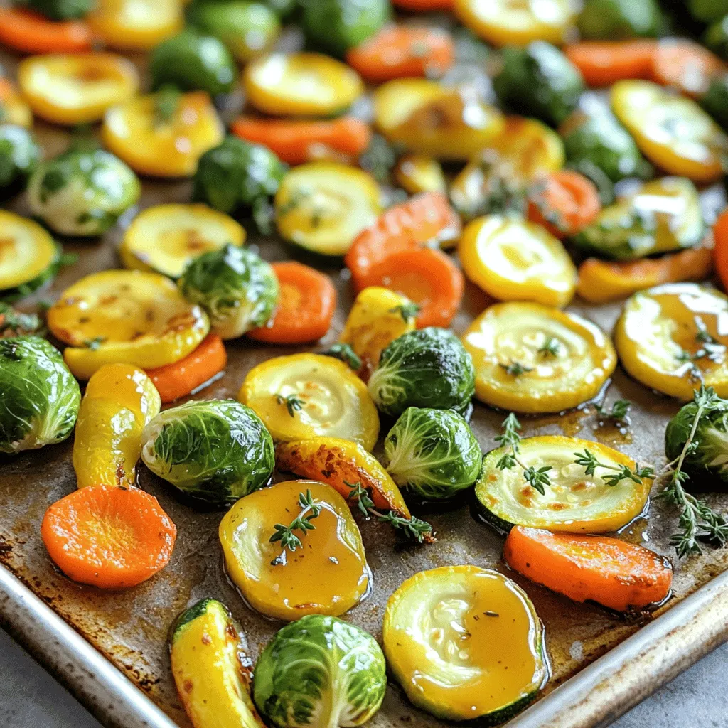 Pour the maple Dijon sauce over the mixed veggies. Toss them well so every piece gets coated. Spread the veggies out on the prepared sheet pan. Keep them in a single layer for the best roast. Place the pan in the oven and roast for 25-30 minutes. Halfway through, give the veggies a toss. They should come out tender and caramelized. When done, let them cool for a couple of minutes. Garnish with fresh thyme before serving. Enjoy your delicious Maple Dijon Roasted Veggies!