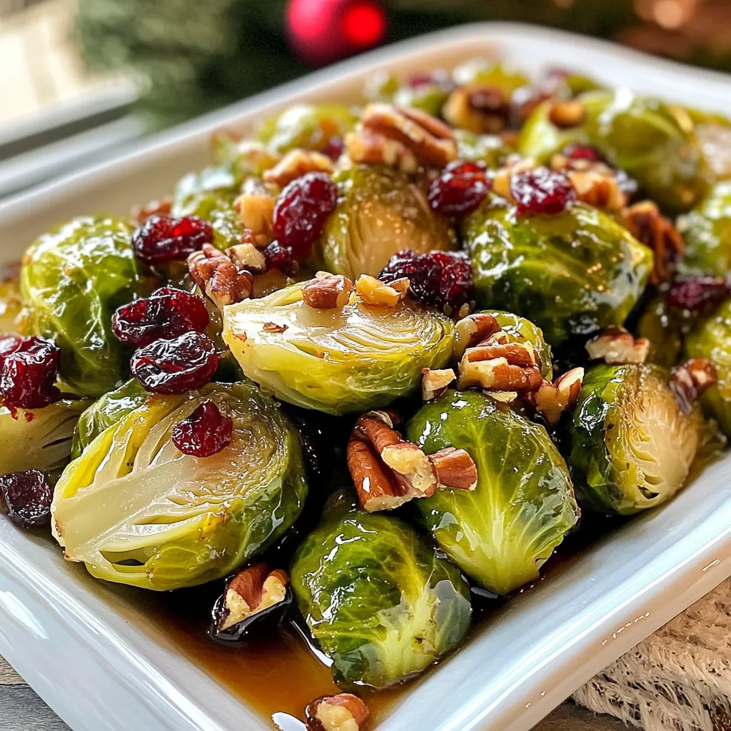 A delicious side dish featuring roasted Brussels sprouts with a sweet maple glaze, topped with pecans and cranberries.