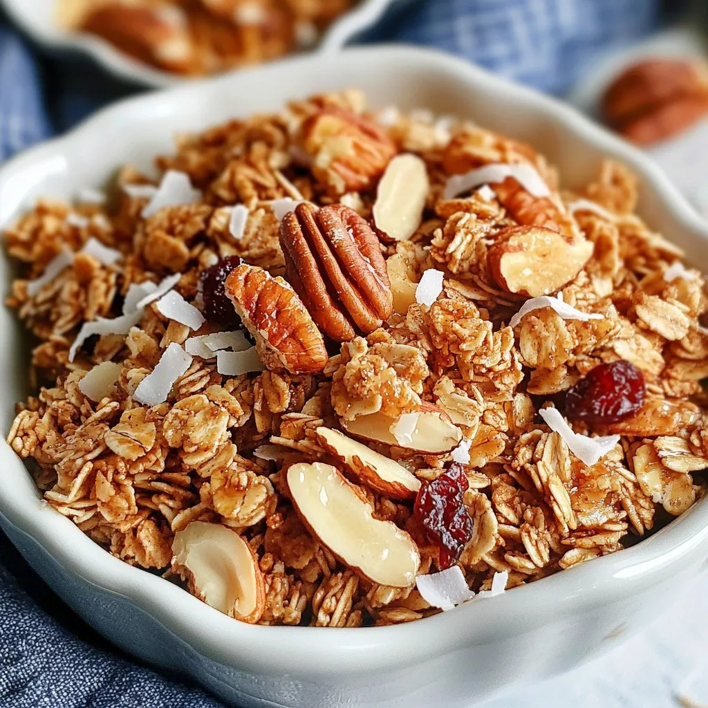 Each ingredient plays a key role. The rolled oats give the granola its base and texture. Chopped pecans add a nice crunch and flavor. Almond slices give it a bit of sweetness. Shredded coconut brings a tropical twist. Maple syrup acts as a natural sweetener and helps bind the granola.