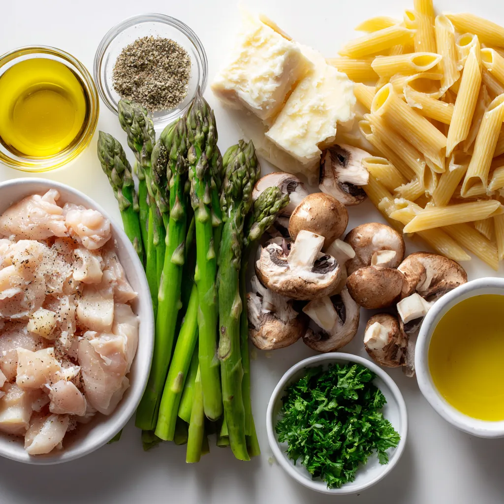 The main components of this dish are simple but flavorful. The penne pasta serves as a hearty base. Using boneless, skinless chicken keeps it lean, while asparagus and mushrooms add a nice crunch and earthiness. You can choose cremini or button mushrooms based on your taste.