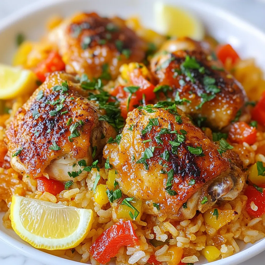 A flavorful one-pan dish featuring chicken thighs, rice, and a medley of vegetables, perfect for a comforting meal.