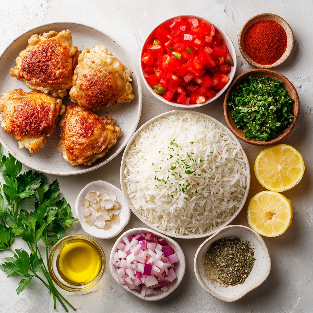- 4 chicken thighs, skin-on and bone-in - 1 cup long-grain rice - 1 medium onion, finely chopped - 3 cloves garlic, minced - 1 red bell pepper, diced - 1 green bell pepper, diced - 1 can (14 oz) diced tomatoes with juice - 2 cups chicken broth - 1 teaspoon smoked paprika - 1 teaspoon dried oregano - 1/2 teaspoon saffron threads (optional) - Salt and pepper to taste - 1 tablespoon olive oil - Fresh parsley, chopped (for garnish) - Lemon wedges (for serving) I often choose brands that deliver great flavor. For chicken, I like using Bell & Evans. Their chicken is fresh and free-range. For rice, I recommend Lundberg Farms. Their long-grain rice is high quality and cooks well. For spices, Penzeys Spices offers rich smoked paprika and oregano. These brands help elevate your dish. When buying chicken, look for shiny skin and no off smell. Choose thighs that feel firm. For vegetables, select bell peppers that are bright and firm. The onion should feel heavy for its size and have a dry skin. Fresh garlic should be plump and firm. When picking tomatoes, go for those that are ripe and fragrant. Fresh ingredients make a big difference in flavor. {{ingredient_image_1}} Start by heating olive oil in a large skillet over medium-high heat. Season the chicken thighs with salt, pepper, and smoked paprika. Once the oil is hot, place the chicken thighs skin-side down in the pan. Sear them for about 5 to 7 minutes until they turn golden brown. Flip the chicken and cook for another 3 to 4 minutes. Remove the chicken from the pan and set it aside on a plate. In the same pan, add the chopped onion and diced red and green bell peppers. Sauté these for about 5 minutes until the onions become clear. Then, mix in the minced garlic and cook for an extra minute until you smell its flavor. Next, stir in the long-grain rice, ensuring it gets coated in the vegetable mix. Toast the rice for about 2 minutes, stirring it often to prevent burning. Now it's time to bring everything together. Add in the can of diced tomatoes with juice, chicken broth, dried oregano, and saffron threads if you choose to use them. Stir well and bring the mixture to a simmer. Place the seared chicken thighs on top of the rice mix, skin-side up. Cover the pan with a lid and lower the heat. Let it cook for about 25 to 30 minutes until the rice is soft and has soaked up the liquid. Once cooked, fluff the rice with a fork and let it sit off the heat for about 5 minutes before serving. Top it off with fresh parsley and serve with lemon wedges for a zesty touch. To get the best flavor, start with the right heat. Use medium-high heat when adding your chicken thighs. This helps create a nice, golden crust. Season the chicken well with salt, pepper, and smoked paprika before searing. Make sure the oil is hot before adding the chicken. Don’t overcrowd the pan; this can trap steam and prevent browning. Sear skin-side down for 5 to 7 minutes, then flip. This step adds depth to the dish. Fluffy rice is key to making this dish a success. After you add the rice to the pan, toast it for 2 minutes. This helps the rice absorb flavors better. Stir it gently so it doesn't stick. When you add the broth and tomatoes, make sure to bring it to a simmer before adding the chicken. Cover the pan tightly to trap steam. Let it cook on low heat for about 25 to 30 minutes. This way, the rice cooks evenly and stays fluffy. Using the right tools makes cooking easier. Here’s what I recommend: - Large skillet or sauté pan: A good, heavy pan helps with even cooking. - Wooden spoon: Great for stirring without scratching your pan. - Lid: A tight-fitting lid is key for steaming the rice. - Fork: Use this for fluffing the rice after cooking. These tools will help you make the best One Pan Spanish Chicken Rice. Enjoy the process and the tasty results! Pro Tips Use Bone-In Chicken Thighs: They are more flavorful and stay juicier during cooking compared to boneless cuts. Toast the Rice: Sautéing the rice for a couple of minutes enhances its nutty flavor and helps prevent it from becoming mushy. Let it Rest: Allowing the dish to sit for 5 minutes after cooking helps the flavors meld and the rice to firm up slightly. Garnish with Fresh Herbs: Adding fresh parsley not only brightens the dish visually but also adds a fresh flavor that complements the meal. {{image_2}} To make this dish even better, you can add chorizo. Slice it and cook it with the chicken for a rich taste. You can also toss in peas during the last few minutes of cooking. This adds color and a nice pop of sweetness. Other great options include olives or artichoke hearts. These give a Mediterranean twist to the dish. If you need a gluten-free version, use gluten-free rice. Check the broth too; some brands add gluten. For a vegetarian meal, swap the chicken for mushrooms or bell peppers. Use vegetable broth instead of chicken broth. This keeps the flavors rich without meat. You can also make this dish in the oven. After searing the chicken, place everything in a baking dish and cover it. Bake at 375°F for about 30-35 minutes. For a slow cooker, follow the same steps but set it on low for 6 hours. This method makes the chicken very tender. Each method brings out different flavors, so try them all! After enjoying your One Pan Spanish Chicken Rice, store any leftovers in an airtight container. Make sure to cool the dish to room temperature first. This helps keep the flavors fresh. Place the container in the fridge. It will last up to four days. To reheat, use the stovetop or microwave. If you use the stovetop, add a splash of broth. Heat it over low heat, stirring often. This keeps the rice from drying out. If using a microwave, cover the container loosely. Heat in short bursts, stirring in between, until it’s hot. For longer storage, freeze the chicken rice. First, let it cool completely. Then, pack it in freezer-safe bags or containers. Make sure to squeeze out excess air. Label the bags with the date. You can freeze 