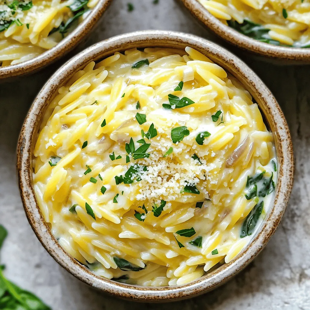 This dish is quick and easy. Gather your ingredients first. You will need orzo, olive oil, garlic, onion, vegetable broth, heavy cream, Parmesan cheese, spinach, salt, and pepper. Measure everything out for a smooth cooking process.